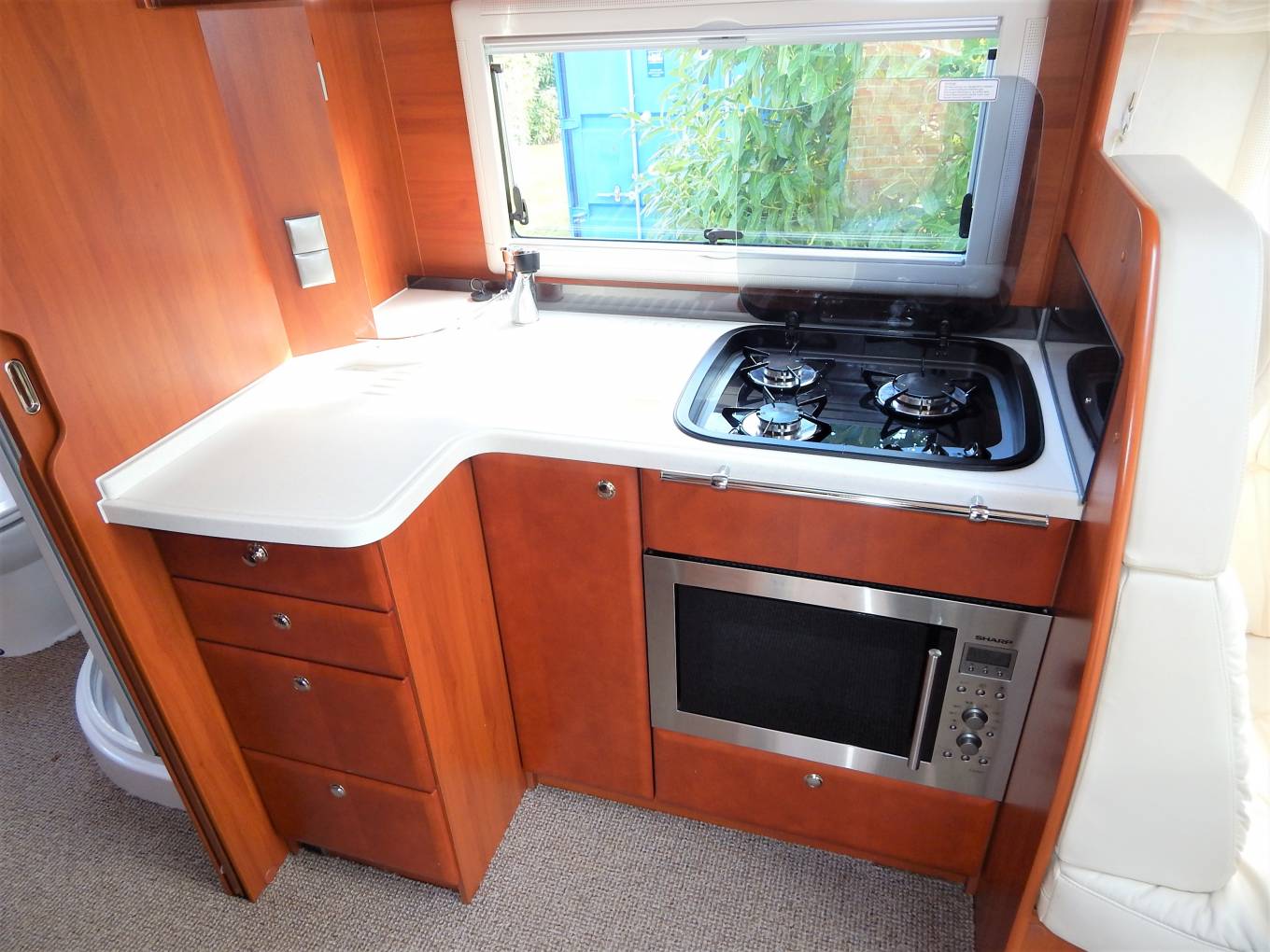 Large L shape kitchen with upgrade package including Dometic 190 litre refrigerator / gas oven with grill combination in dark finish refrigerator front, White (sanded cream) mineral material kitchen worktop with seamlessly integrated sink (including bathroom sink made of the same material), Thetford 3 burner gas hob, Sharp 26 litre Combination microwave oven and grill, Extendible mixer tap and Turbo roof vent.