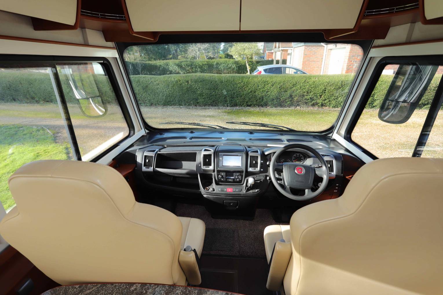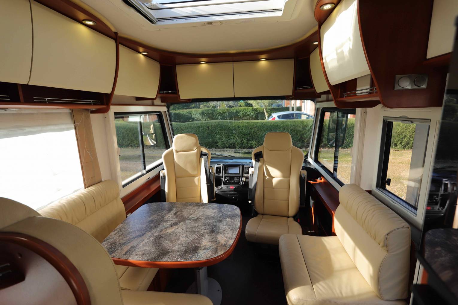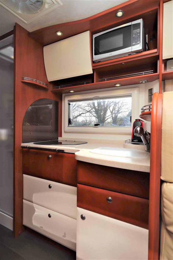 We enter the Motorhome on the Driver’s side immediately to the right is the Dinette which comprises of an L shaped sofa on the opposite side with 2 forward facing traveling seats with 3 point seat belts. On the Opposite side is a smaller 2 seater sofa both upholstered in smooth sandstone leather. The table is height adjustable and can be moved to be central in the area so that you could easily seat 7/8 for dinner by rotating the front seats if entertaining on site. This area can then be transformed into a double bed for guests by dropping the table and using an infill cushion. The 22” LED TV with electric drop down mechanism is situated under side cupboards on right.