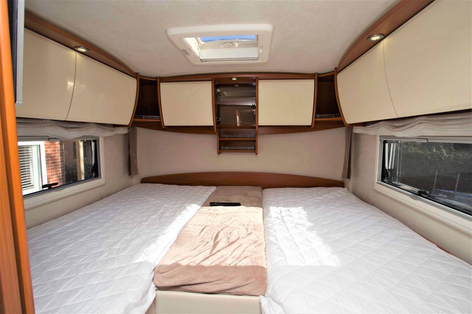 Main Bedroom; is a fixed twin single beds layout with infill cushion, sprung with optional suspension system. Plenty of overhead cupboard space and Avtex TV point to the foot of the driver’s side of the bed.