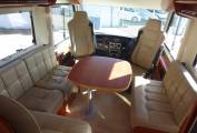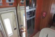Offering panoramic views when driving and at leisure, the spacious cab can be utilised to enhance the forward leisure/dining/work space by rotating the swivel seats. With integrated leather upholstery throughout, L-shaped nearside seating and an opposing double seat mean that 6 or 7 people can be hosted around the large adjustable table. For privacy the windscreen can be shielded by an electric aluminium Insulated blind, and the cab side windows also have concertina blinds. Above the cab is a pull down double bed.