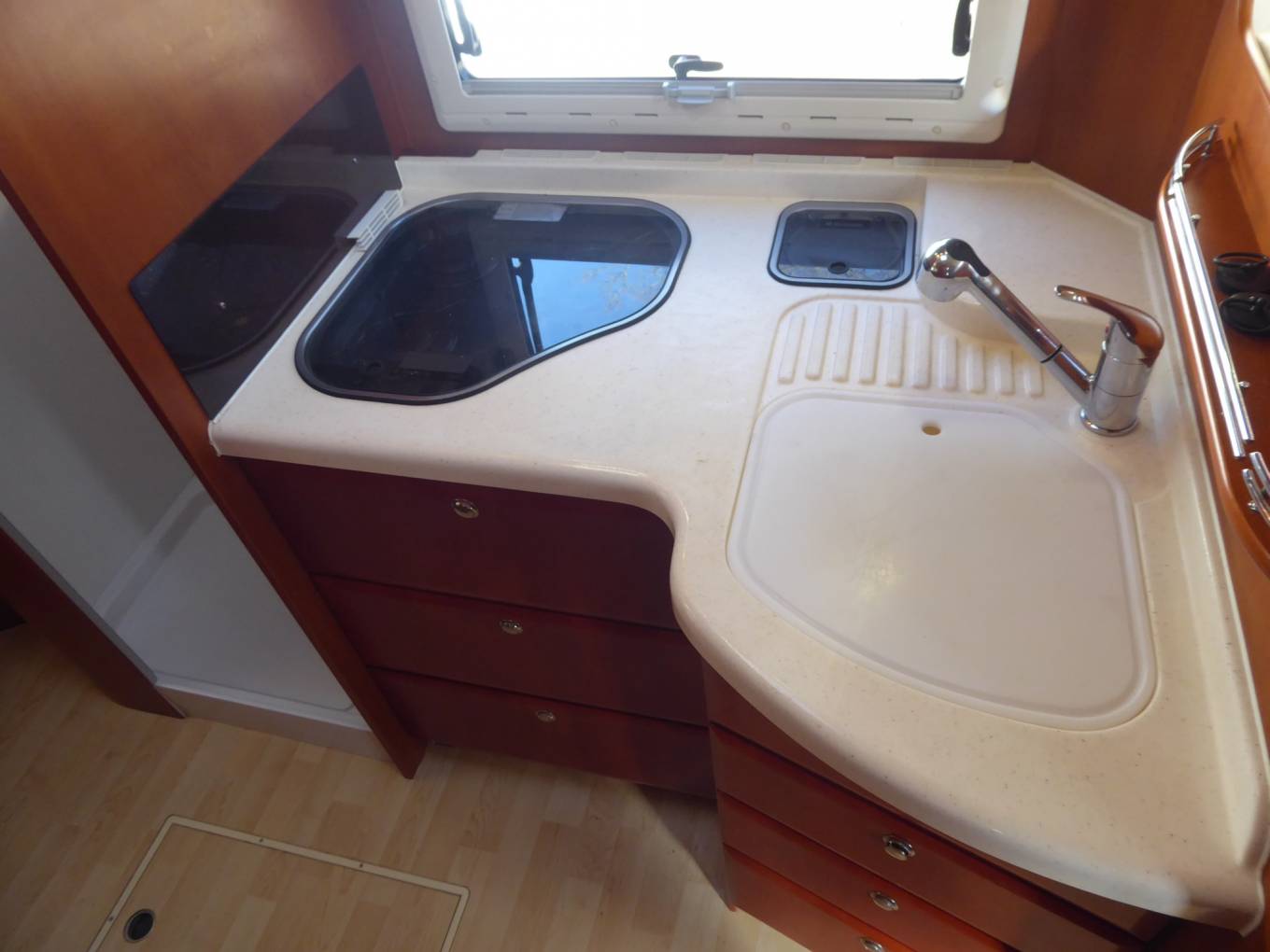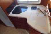 For food storage and preparation, the conveniently adjacent central kitchen features a 144ltr fridge and a separate 31ltr freezer, a combination oven/grill, and a seamless Corian worktop into which is set a hob with three gas burners, and a sink.
