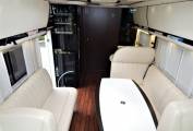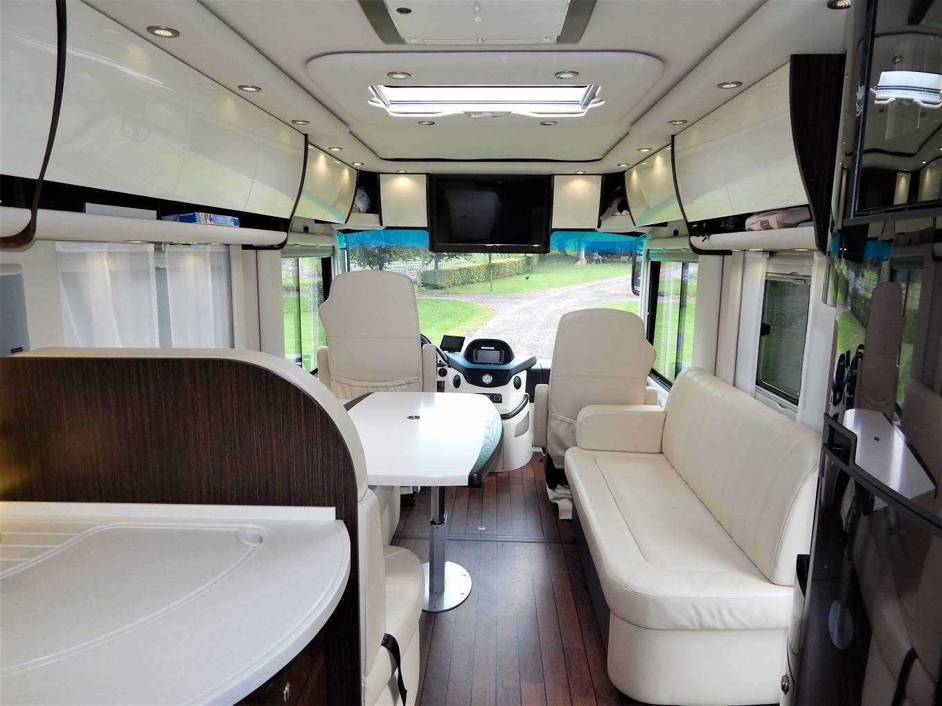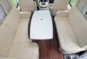 We enter the motorhome on the passenger side via an electric step immediately to the right is the large dinette upholstered in Mother of Pearl full leather, the twin swivel multi adjustable cab seats rotate to join this area ( including air suspension; lumbar support; Seat heating ), Smaller Side Sofa; Large L shape sofa with 1 additional seatbelt. You could easily seat 7/8 people if entertaining on site. The Central table can easily be positioned, and has a height adjustment so it can drop down to make up the second double bed at night.