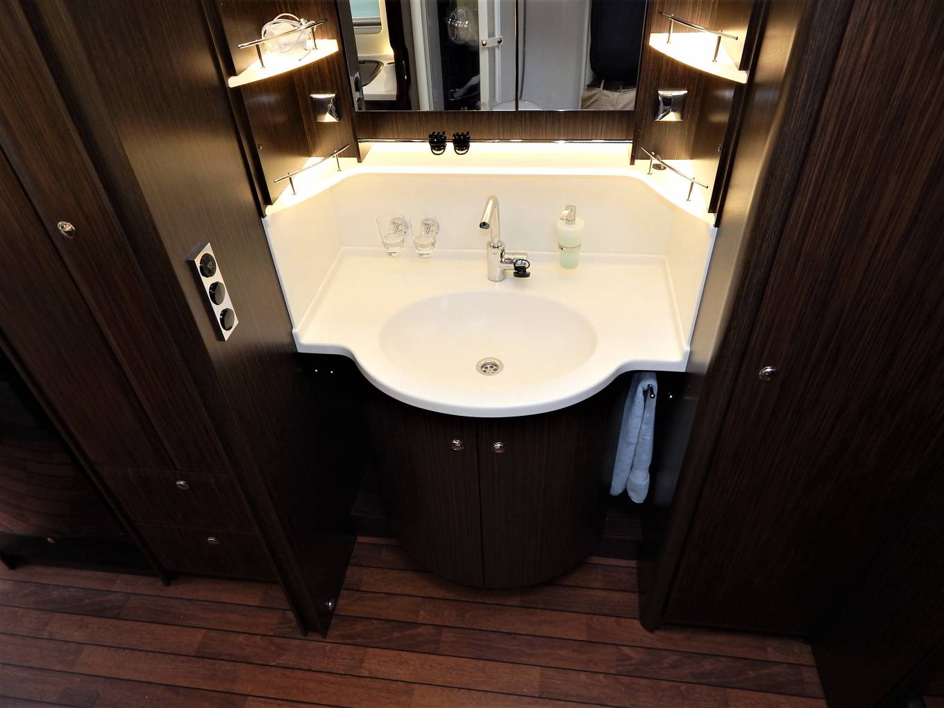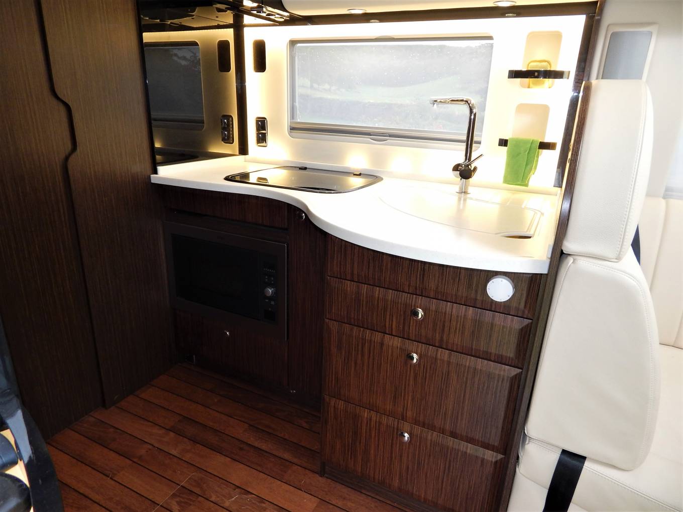 L shape kitchen- White Corian style single piece kitchen worktop with seamlessly integrated sink with extendible chrome mixer tap, Thetford 3 burner gas hob, and Turbo roof vent. There is ample cupboard and drawer space for all your cooking utensils above and below a Microwave Combination oven ( original equipment was a dishwasher which could be re fitted in place of combination oven). Opposite is a Dometic Tec Tower; 190 litre 3 way fridge that can be powered by 240v;12v or gas, above a Gas Oven & Grill. There is a coffee machine that electrically lowers from under the wall units.