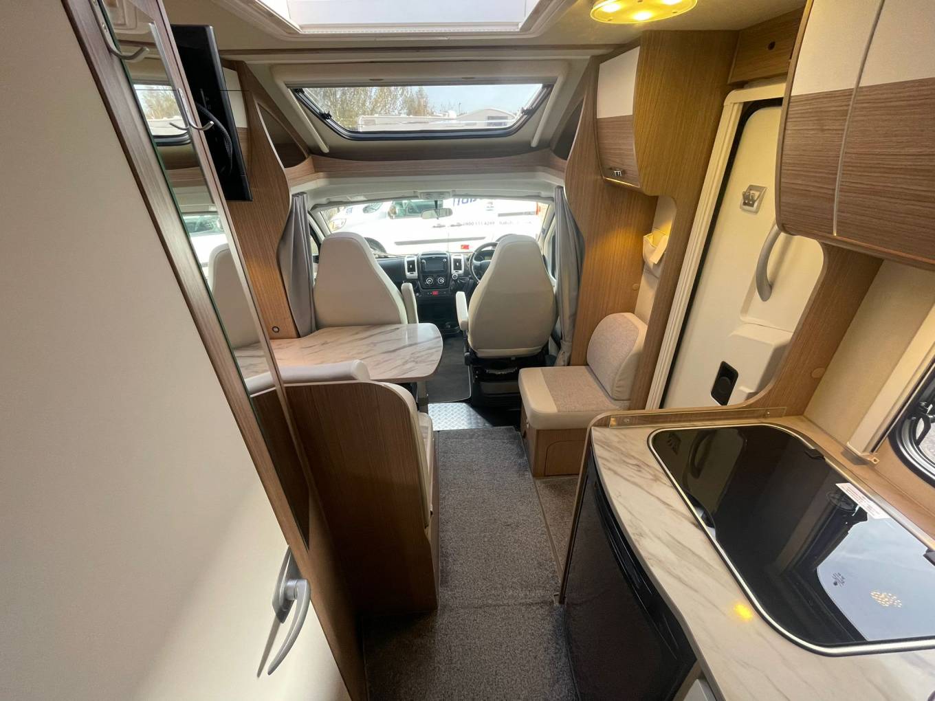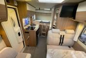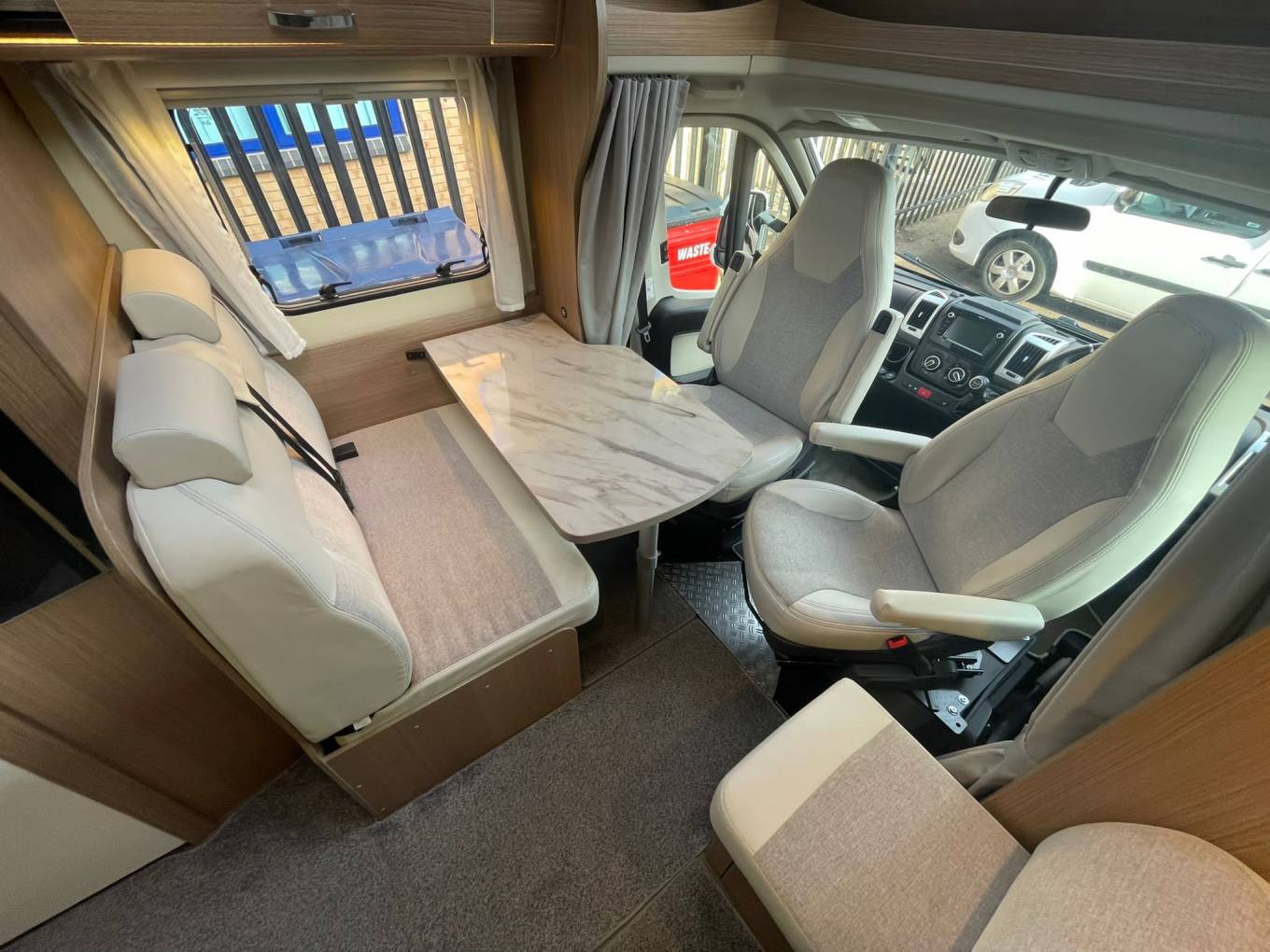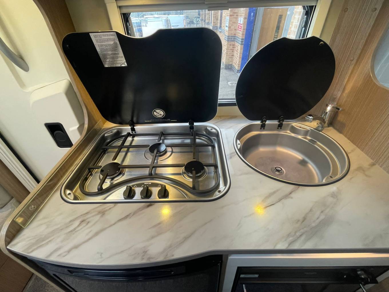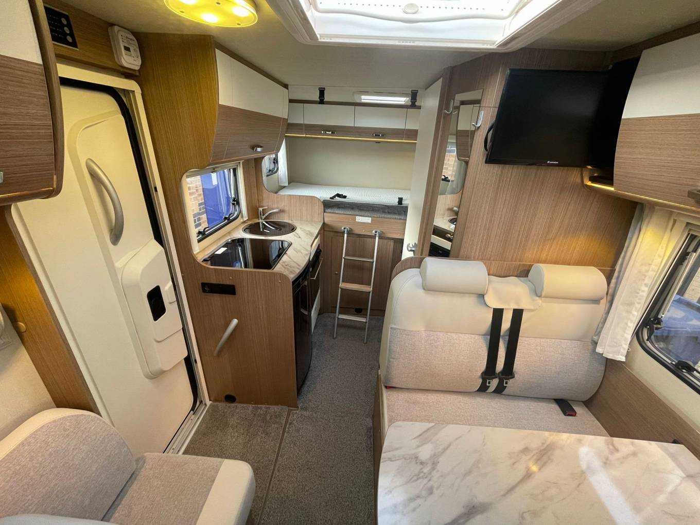 If you’re looking for a luxury vehicle that is less than 6 meters in length, comes as a 3500kg chassis which has the added benefit of 4 seat belts for those unexpected times you need to carry people, then this might be the van for you. The engine is the Fiat 2.3 130bhp with power steering and a 6-speed manual gear box making it agile and comfortable to drive on those long distances. It also benefits from cab air con and electric windows and mirrors for driver comfort. The lounge area benefits from a half dinette with the 2 front seats swivelling. Leading to the rear there is a transverse bed over inside storage and a rear garage for those much-needed extras. For those who like to cook whilst away there is a 3-burner hob with integrated oven and grill.