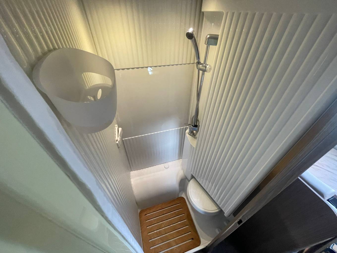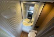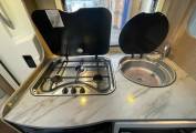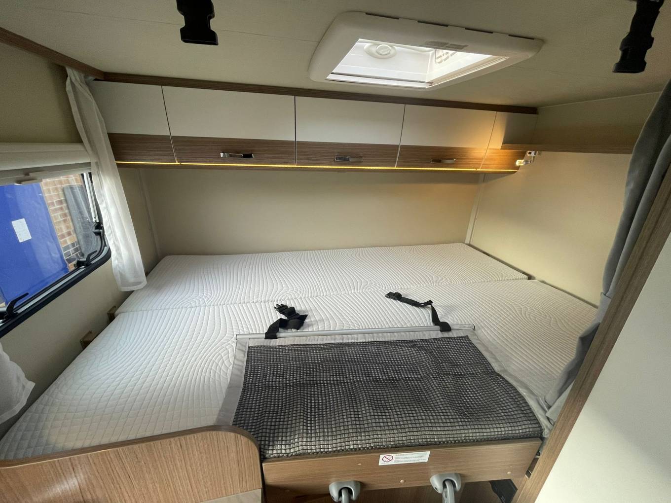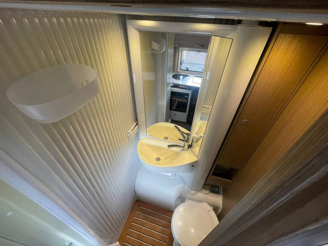 If you’re looking for a luxury vehicle that is less than 6 meters in length, comes as a 3500kg chassis which has the added benefit of 4 seat belts for those unexpected times you need to carry people, then this might be the van for you. The engine is the Fiat 2.3 130bhp with power steering and a 6-speed manual gear box making it agile and comfortable to drive on those long distances. It also benefits from cab air con and electric windows and mirrors for driver comfort. The lounge area benefits from a half dinette with the 2 front seats swivelling. Leading to the rear there is a transverse bed over inside storage and a rear garage for those much-needed extras. For those who like to cook whilst away there is a 3-burner hob with integrated oven and grill.