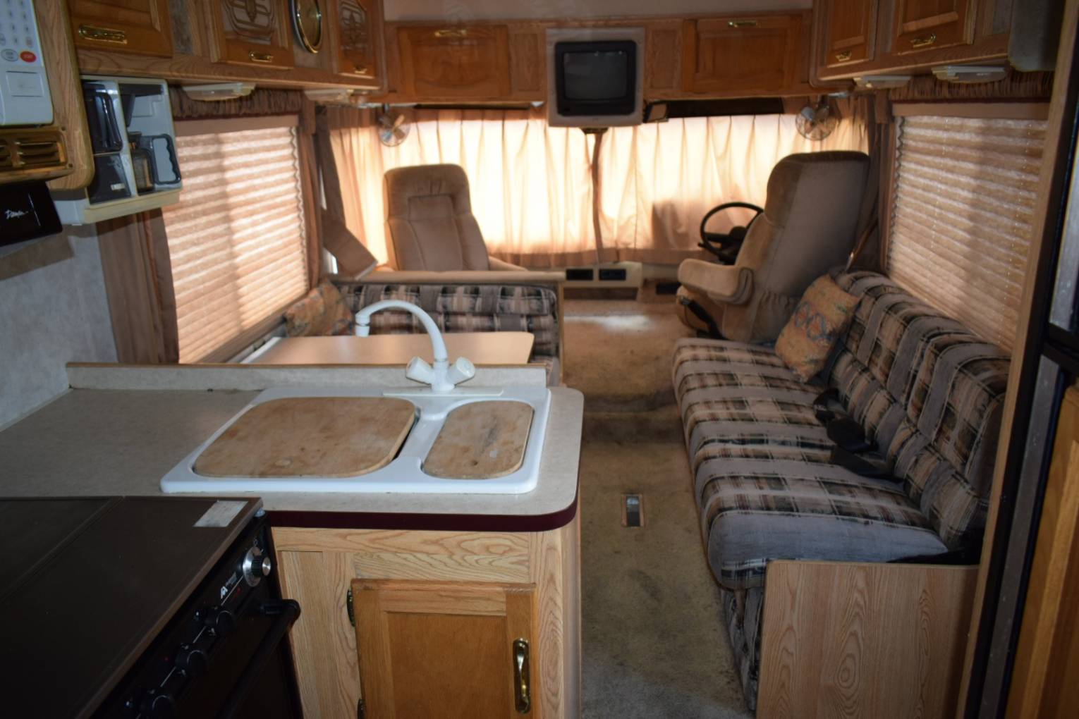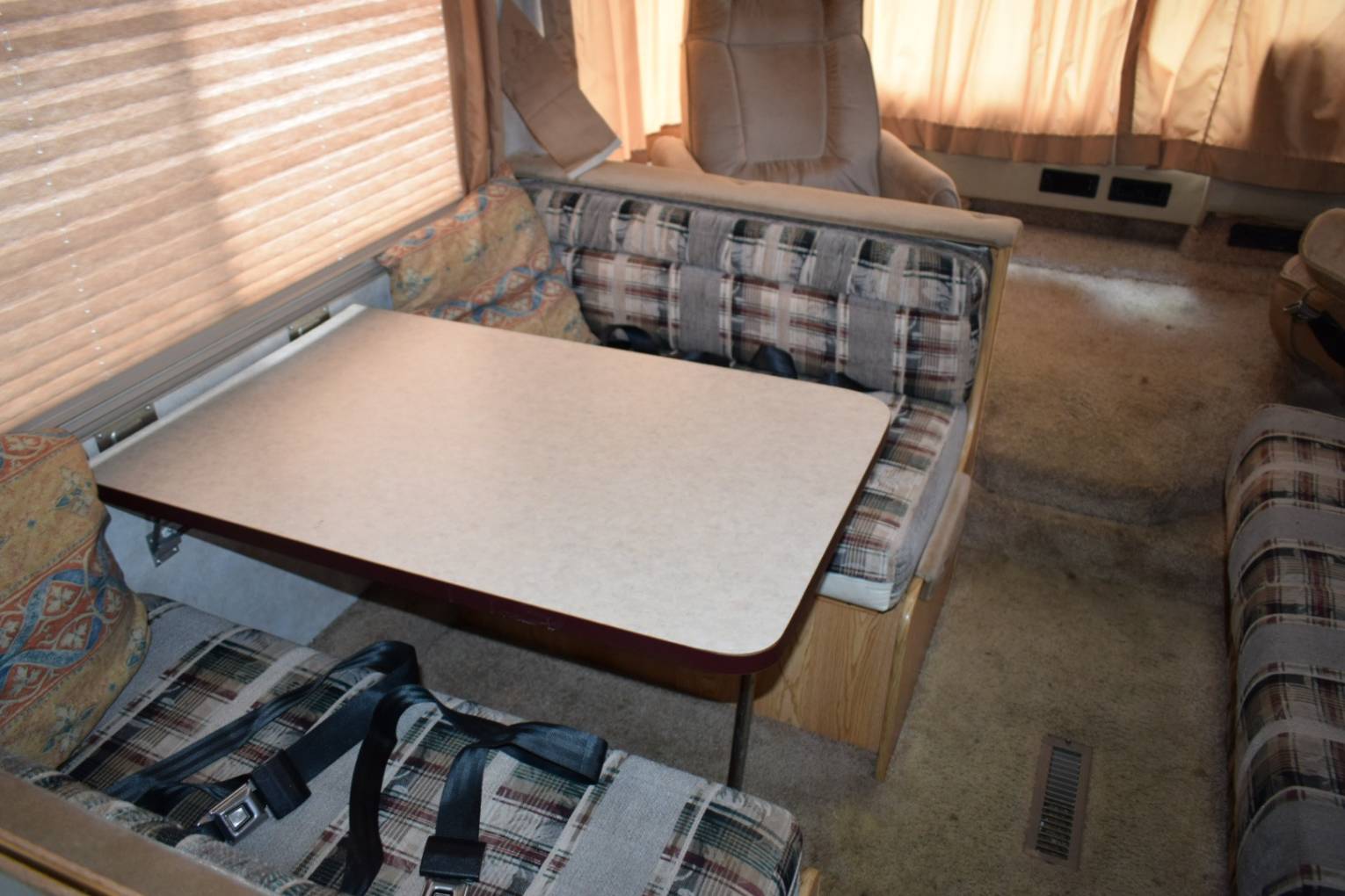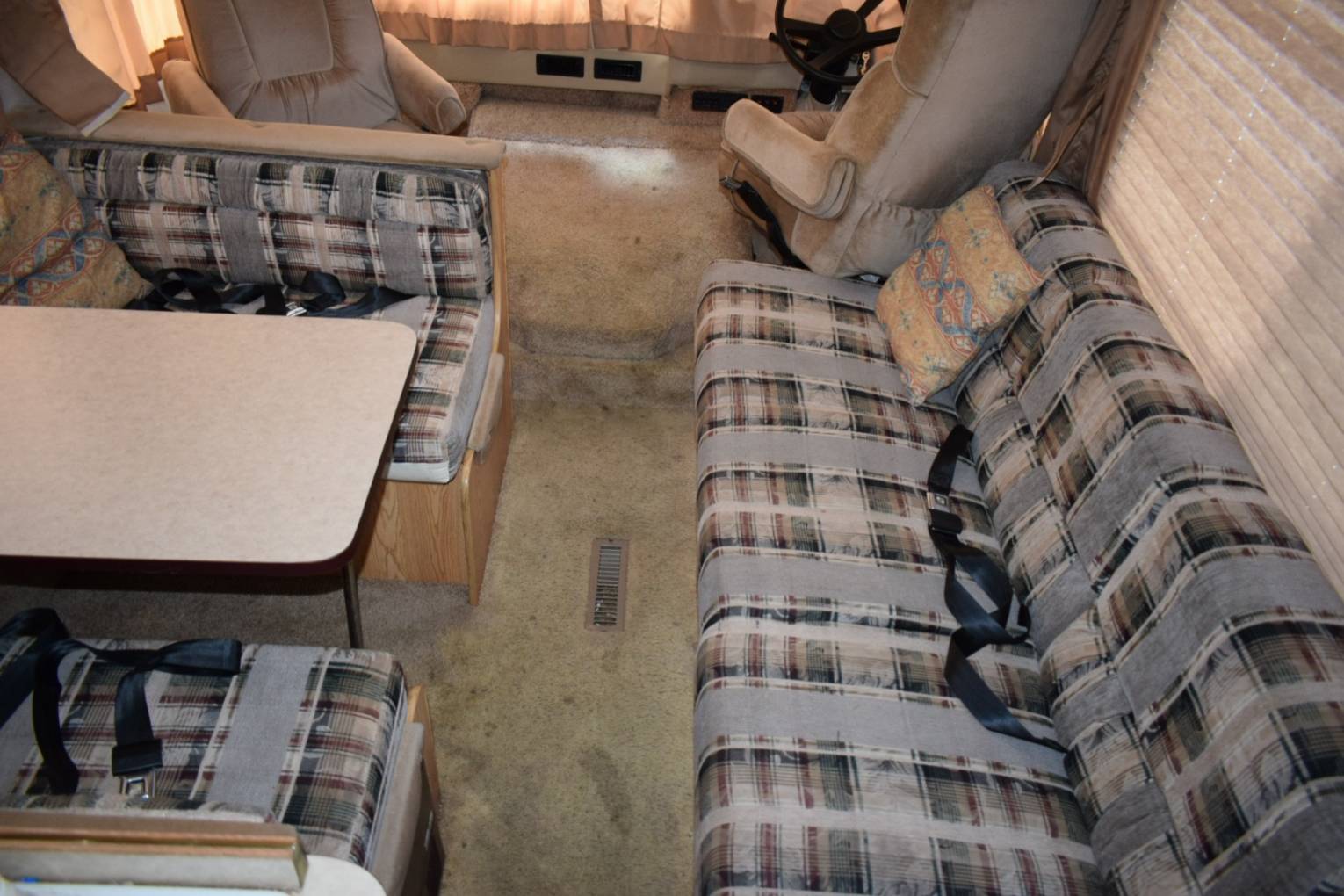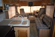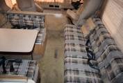 On entering via the automatic step, to your right is the lounge consisting of long settee with a four person dinette opposite. This area easily converts to two double beds with a walkway between. Up front both cab seats swivel.
