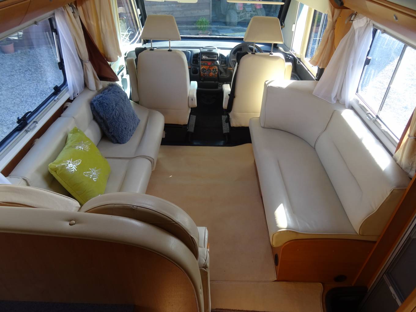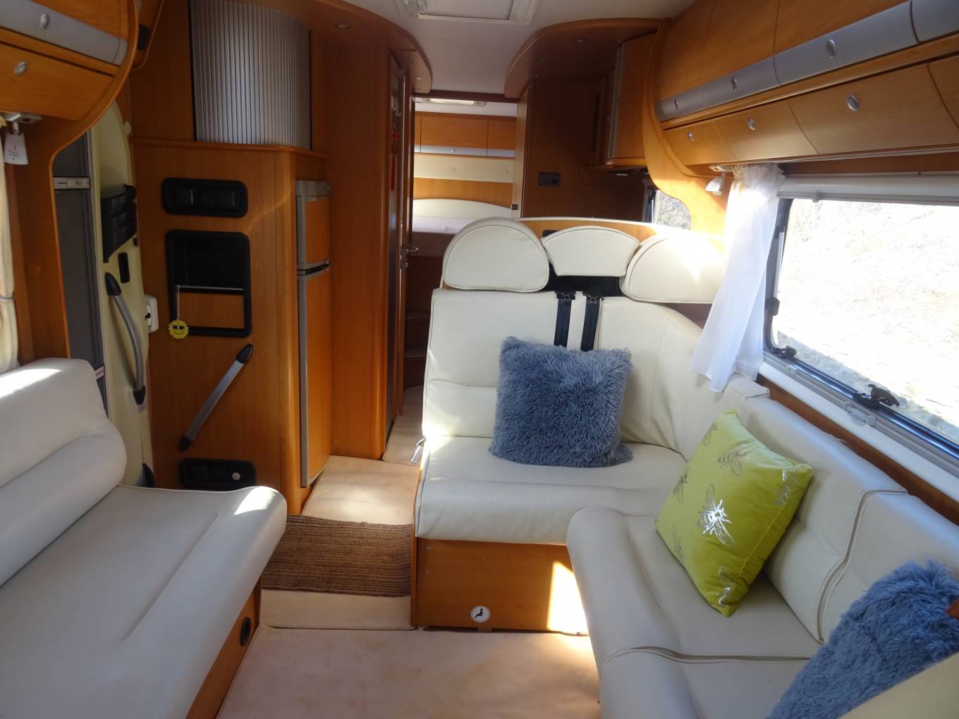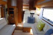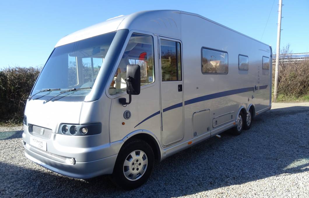 For sale - A great opportunity to own a quality german built A Class Dethleffs Globetrotter Esprit 2.8L tag axle Fiat Ducato based motorhome in lovely condition, which benefits from having had an MOT and Habitation report carried out as recent as February 2022. This impressive motorhome has a King-size fixed transverse bed at the rear with a new memory foam mattress recently fitted and a swivel bracket mounted TV. The bathroom door provides a partion for privacy, when friends or family are using the over-cab bed. The good sized washroom at the rear consists of a Thetford swivel toilet, stainless steel wash basin within a vanity unit and a seperate screened shower. Opposite we have a large wardrobe with two draws for your essential clothing items which, combined with the washroom, provides a rear on-suite facility. The kitchen is centrally positioned and is well equiped with a large Dometic 3-way fridge with seperate freezer, a three ring gas hob, a single bowl sink and a combined oven and grill, all in excellent condition. The lounge upholstery and captain seats are finished in cream leather providing a luxurious feel to the living area with seating for at least seven people, giving ample space for entertaining and watching TV. A good size fold-away table is available for meal times with two smaller tables that can be used for light snacks and drinks. Above the cabin a pull-down bed provides a large double, also with a new memory foam mattress, and with access via a small step ladder. The Esprit does not lack storage space, having a massive amount throughout with overhead airline style locker's, external locker's and a huge garage at the rear. Another great feature of this motorhome is the Alde underfloor heating system which ensures a nice comfortable living space on colder days. The cabin has sliding side windows, main window and side blinds, air-con, a jvc radio/cd player, a reversing camera and has a 2800cc engine with a 5-speed gear box. Externally the Esprit has an Omnistor side awning, a gas BBQ point, 240v plug point, retractable hook-up, a locker with two gas cylinders, a tow bar, further lockers for storage and the huge garage ideal for cycling and watersports equipment.