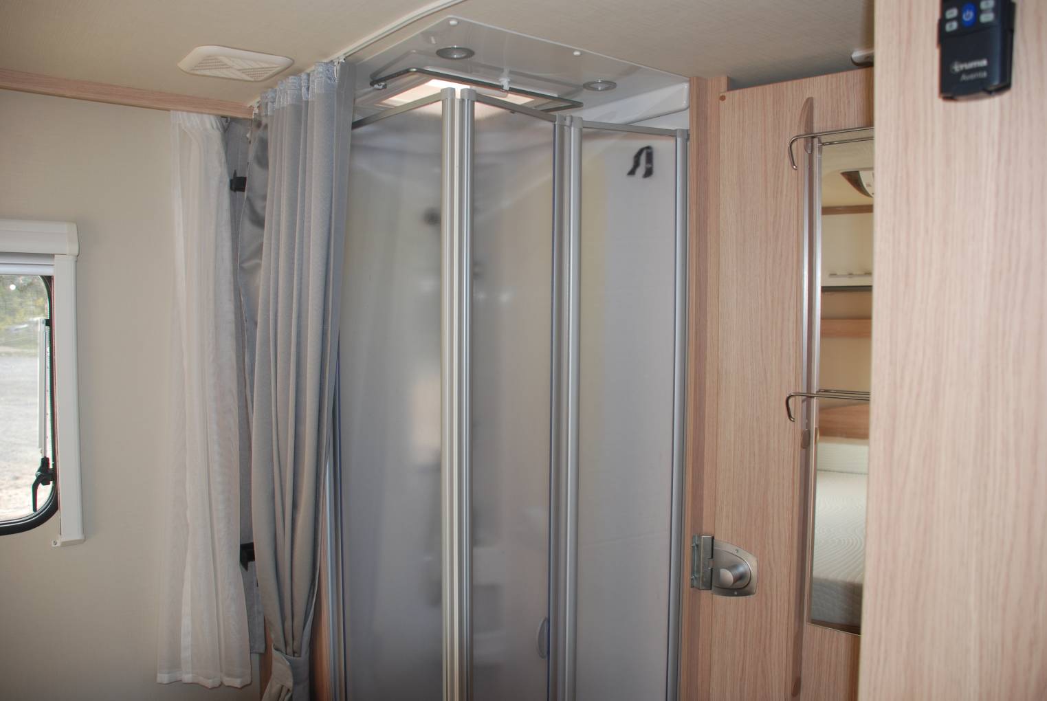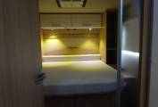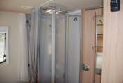 Inside the motorhome on the it is very luxurious. Towards the back is a fixed double island bed, with plenty of storage space around and below the bed. The bed itself has a mechanism to pull it out whilst is use to provide longer leg room for the users. The bedroom is light and airy with lovely LED lighting. Within the bedroom area there is a private toilet and washroom on one side of the motorhome, then opposite there is a separate shower cubicle. With the dividing door to the bedroom this makes it into an en-suite bathroom.