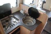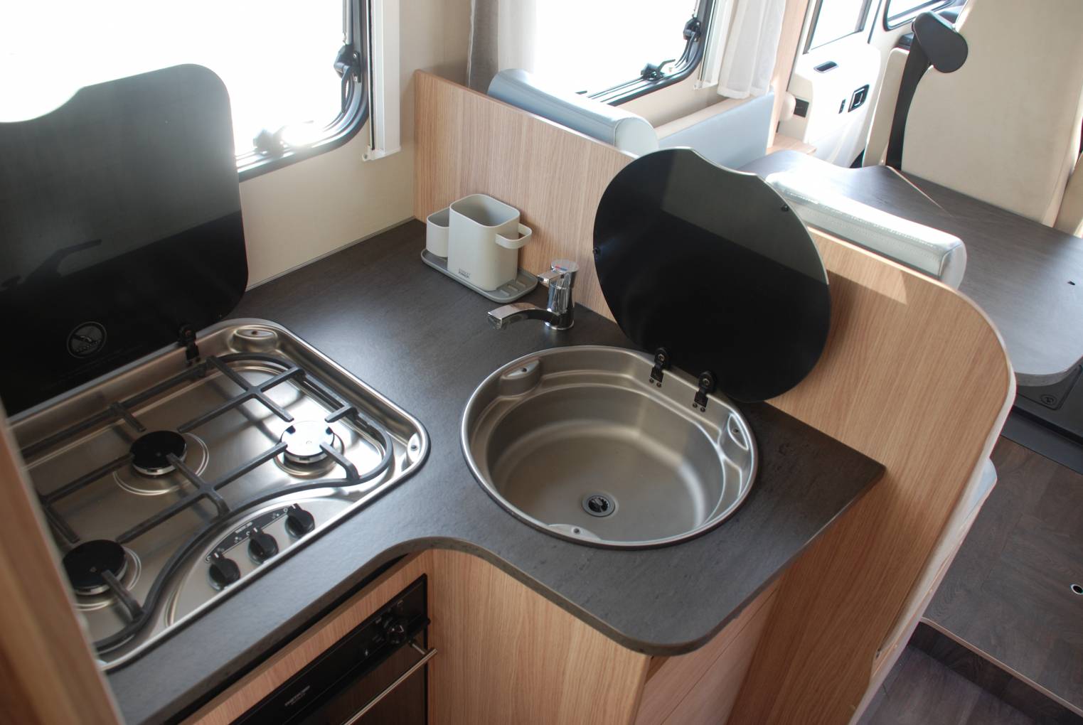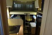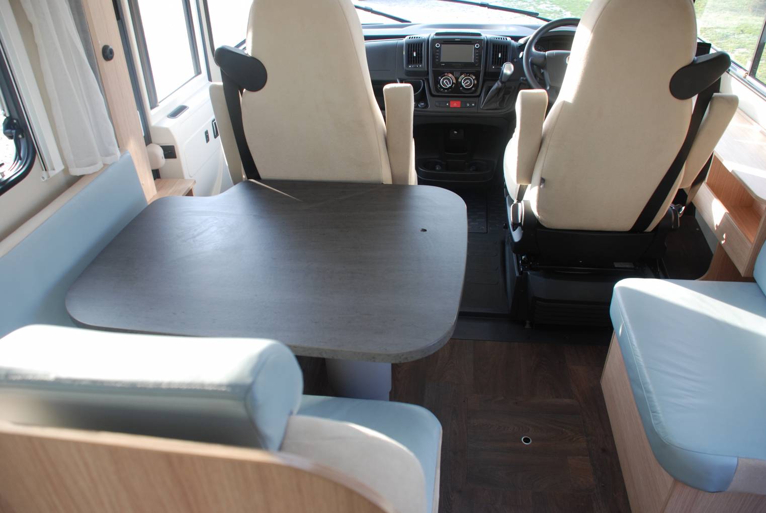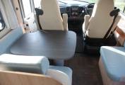 Moving further forward there is a central dinette area, which houses 2 x 3 point harness. With the captains chairs swivelled round and the jump seat next to the habitation door there is plenty of room for socialising. Unfortunately there is a minor blemish to the table top but nothing to major. This area can also be converted into a sleeping area.