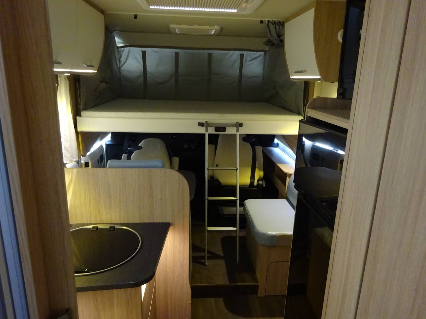 Above the cab area there is a pull down bed which is also very spacious and very comfortable, with has a Luton ladder for access.