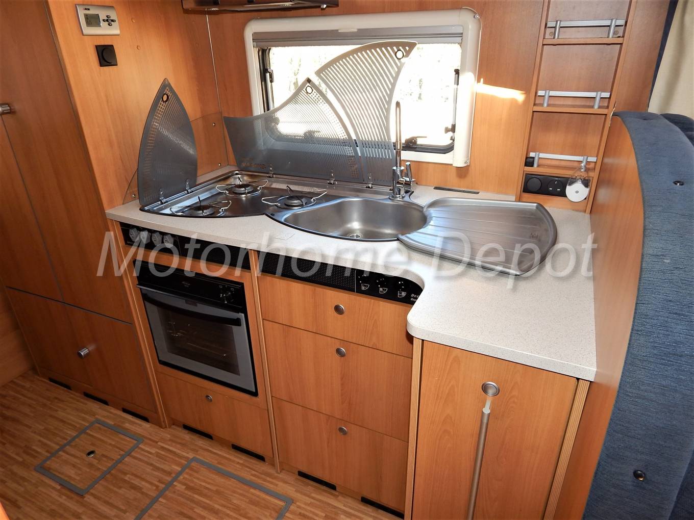 Moving rear is the kitchen which consists of a 3 burner gas hob and stainless steel sink with chrome mixer tap and draining board. Below the counter is a good size Spinflo Duplex Oven & Grill, plenty of cupboard & drawer space above and below for all your cooking utensils. There is also a 12v Thetford extractor above with integrated light.