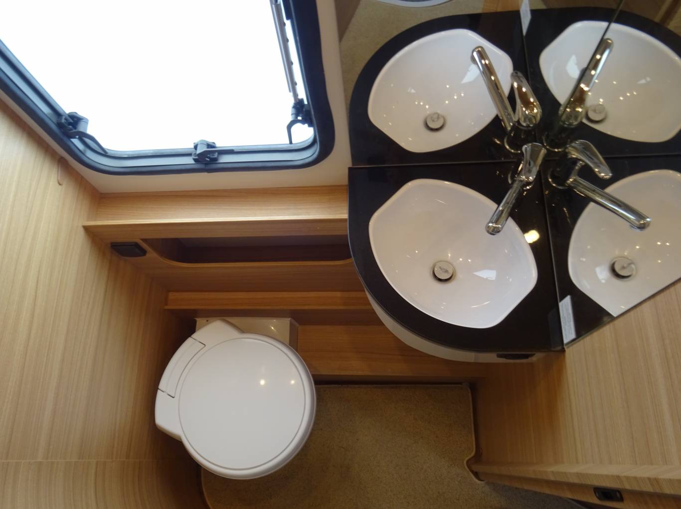 There is a separate toilet and washroom on one side of the vehicle and a separate