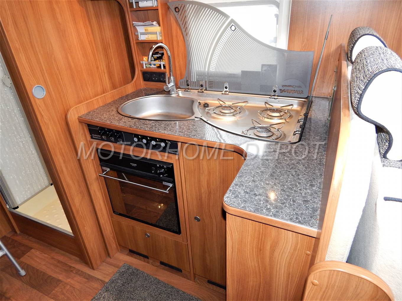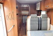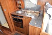 Moving rear is the L shaped galley kitchen which has a combination stainless steel sink and hob unit with hinged glass lids, the hob has 3 gas burners and the sink has a chrome mixer tap. Beneath is a combination gas oven and grill unit, above is an extractor fan. On the opposite side there is a large 3-way powered Dometic fridge with separate freezer box this can be powered by: 240v; 12v or gas depending whether you are plugged in on site or wild camping. There are plenty of upper cabinets and lower drawers for all your holiday provisions. Next is a large hanging wardobe incorporating the signal booster & aerial mast.