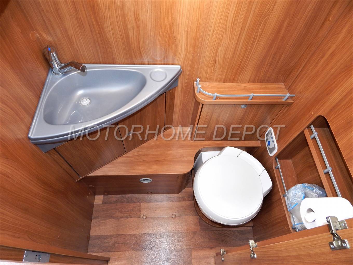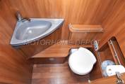 The bathroom area is across the middle of the motorhome it can be sectioned front and rear giving a private area for bathing and dressing. The toilet area on the drivers side consists of a Thetford fresh water flush cassette style toilet, a grey wash handbasin above with a chrome mixer tap. The room gives the feeling of space with plenty of mirrors and cupboards. Opposite is the separate shower cubicle which has Perspex doors to close a chrome mixer tap and shower head on a chrome riser.