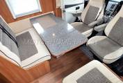 We enter the motorhome on the driver side, to the right of the habitation door is a single seat & immediately opposite is the dinnette. The forward facing sofa has 2 x 3-point lap & diagonal seatbelts. A large fixed dining table with an extending leaf, the two front seats swivel to join the area so you could easily seat 5 around the table if entertaining on site. Upper aircraft style lockers, an AVTEX TV with DVD player plus a large sunroof that floods the lounge with natural daylight.