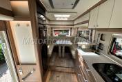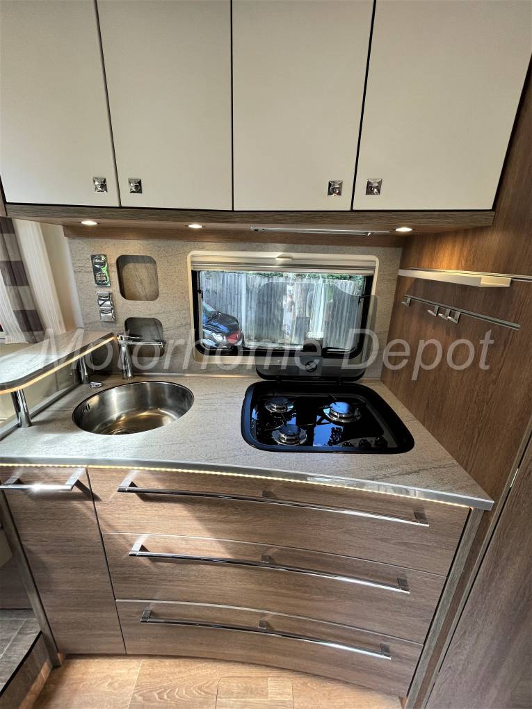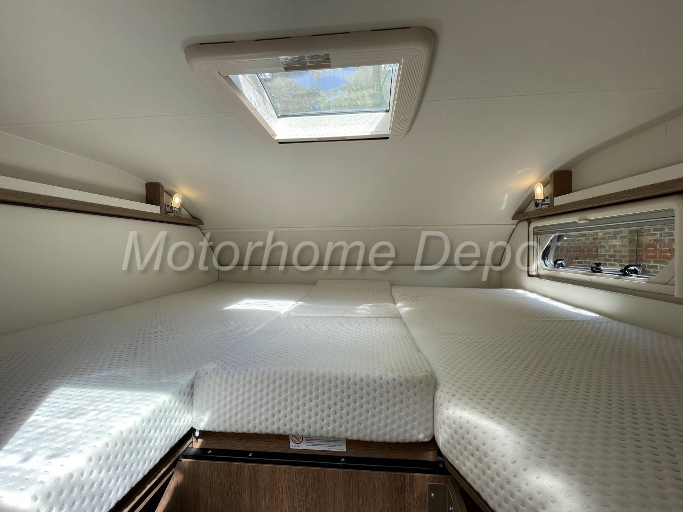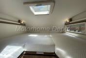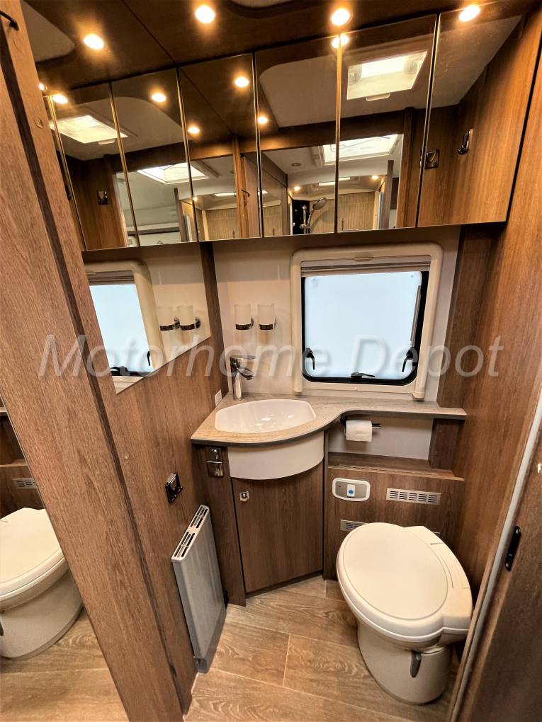 The fully equipped bathroom can be closed off to the accommodation area to create a large en-suite area. A separate shower sits to the offside and on the nearside is the Thetford fresh water flush, cassette style toilet with a wash basin and mixer tap. Large mirrors emphasise the space and light and numerous spacious bathroom cabinets mean you won’t be lacking for storage . A large window floods the bathroom with natural light.