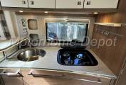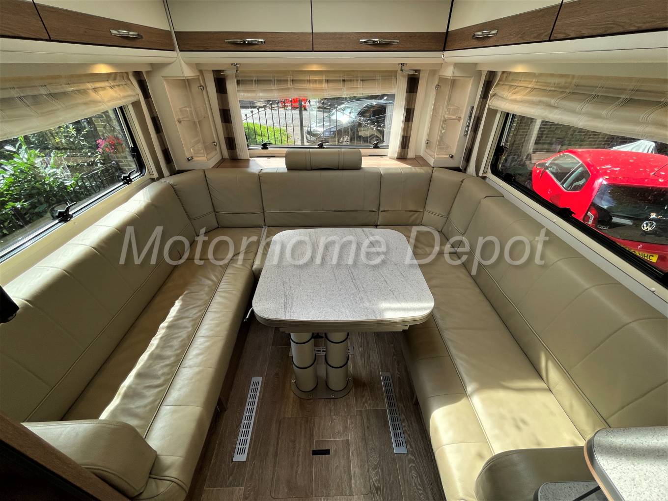 This motorhome looks lovely from the outside but the magic begins when you step through the wide access door. At the rear there is a huge panoramic U-shaped lounge trimmed in leather and this provides plenty of space and light from large double heki’s, the dining table is extendable and multi-directional and will comfortably seat 4-6 people around while entertaining on site. There is a TV/DVD combination for your evening viewing. At night this area converts into a huge bedded area or alternatively you can use it as 2 singles. There are two folding travelling seats situated below the side sofas.