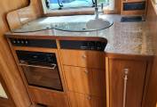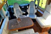 Stepping inside you are greeted by a clustered lounge with adjustable table. The television is housed in a cabinet to your right at head height. Above the drivers cab there is an extra large drop down bed. Below this are several LED spot lights and cabinets. The dining/lounge area can easily accommodate 6 people and the van generally feels very spacious throughout.