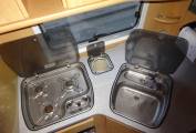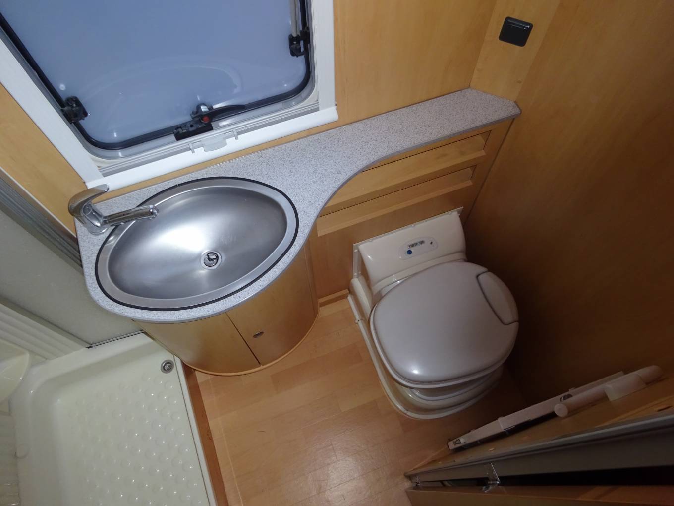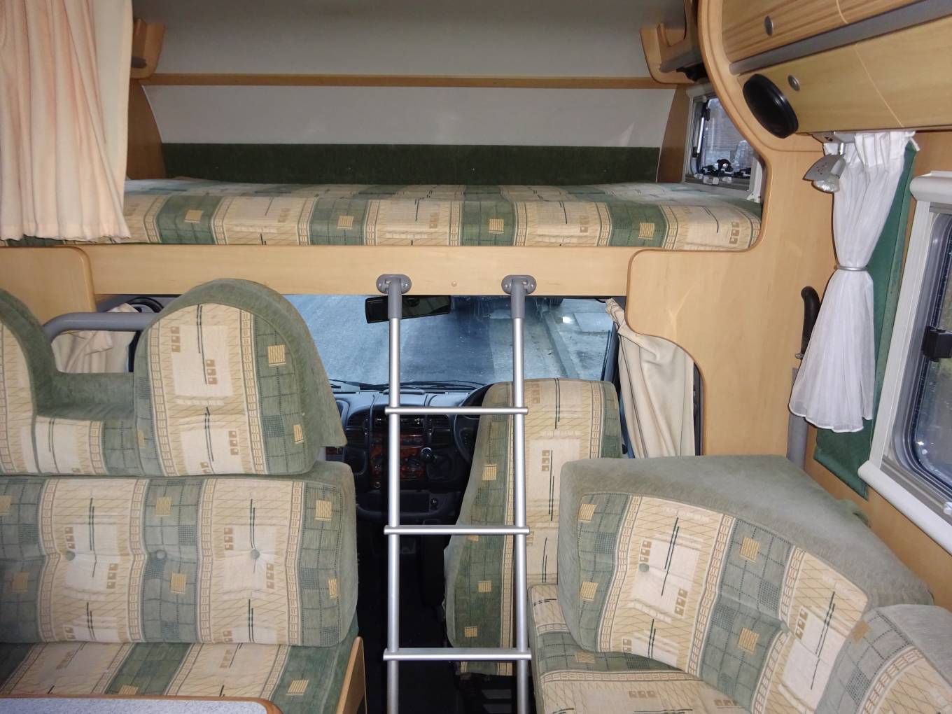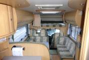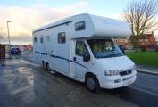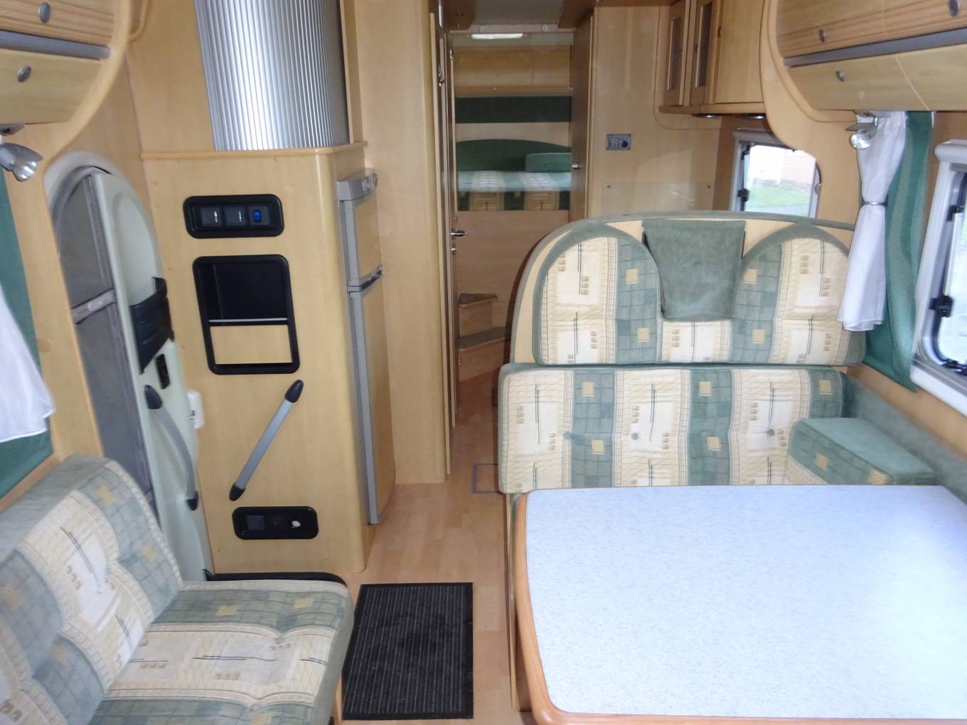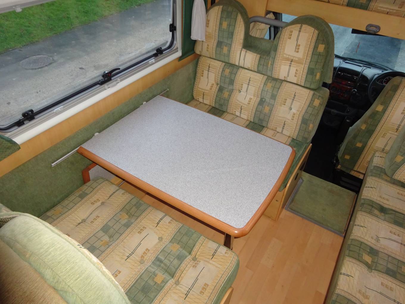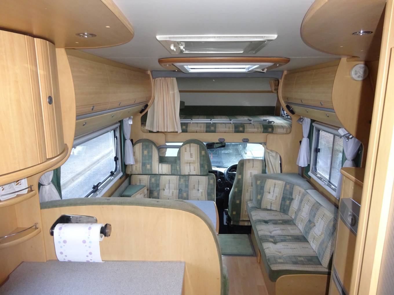 As you step inside the motorhome you find a well equipped kitchen with a large fridge freezer, sink, 3 burner gas hob, oven and grill, and all the storage and workspace you could ever hope for. It has an extremely large seating area, formed in to a corner settee that can accommodate 6 adults easily. The centre dinette easily breaks down in to a large double bed. With another large double bed over the cab and a large fixed bed to the rear. It is fitted with a good bathroom in excellent condition equipped with a separate shower.