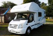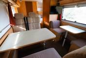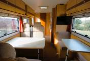 Two fixed sleeping areas, with twin bunks to the rear, and the overhead cab, double bed, are complimented with the spacious lounge converting to provide a further 2 berths and comfortable small double. The lounge/diner is split to provide options, that for a couple or family of four, increase the versatility of the habitation space. To one side are two single seat chairs with removable table between. Opposite, there are two, two seater sofas with removable table between. A TV point with TV included is mounted to the top corner of the lounge area. Storage provided both under the seats and with the overhead lockers to both sides.