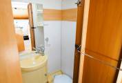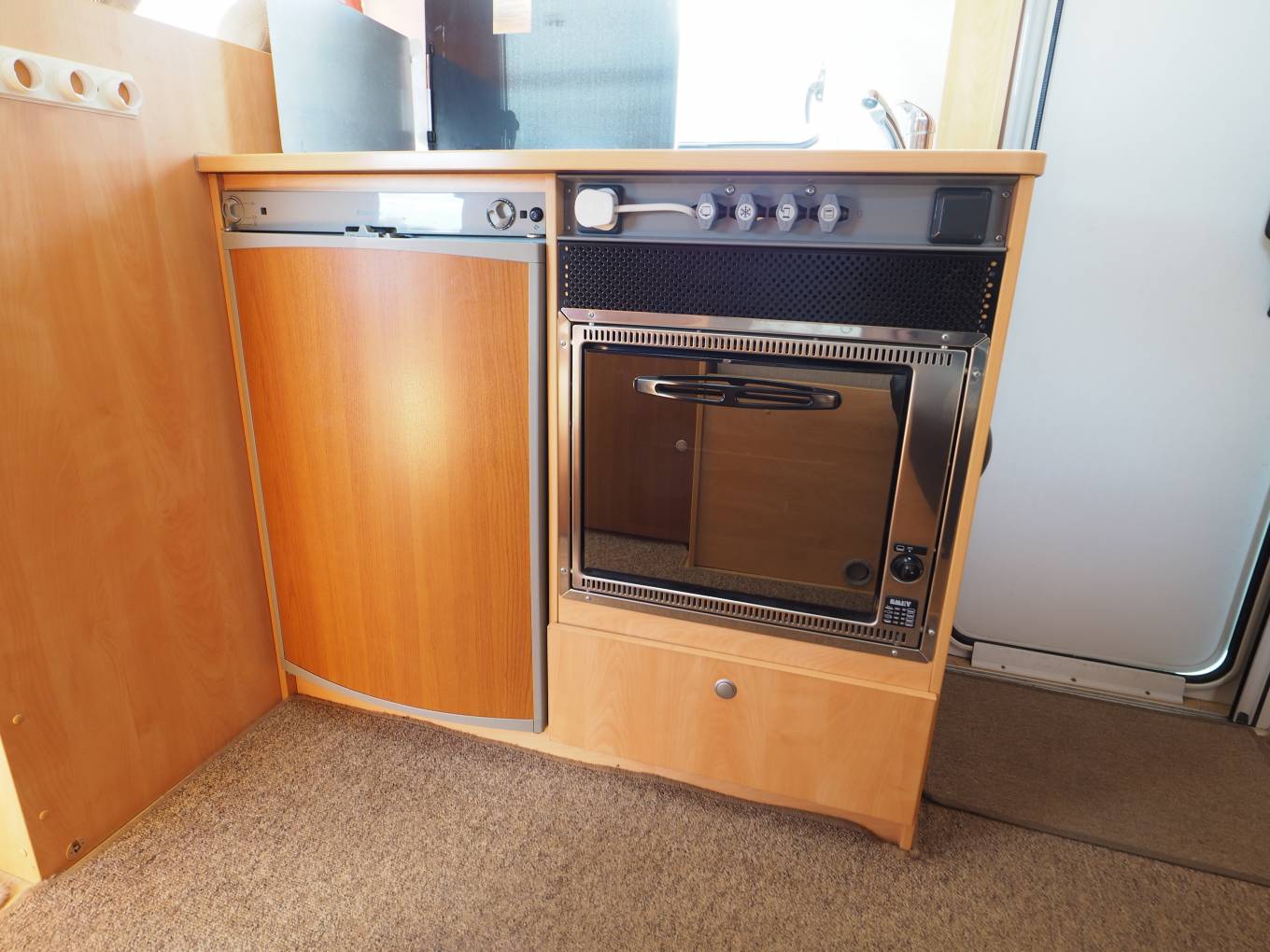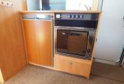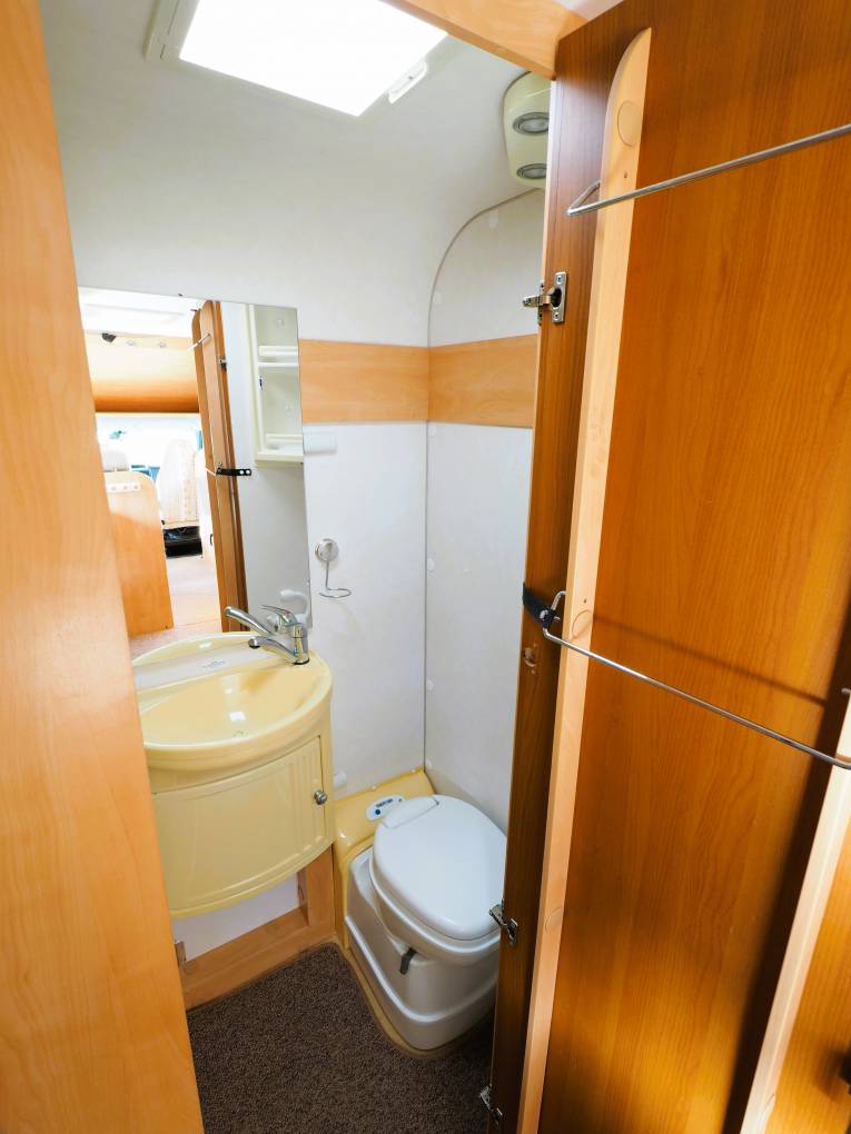 The central kitchen is well equipped with a 3 burner gas hob and sink with hot and cold running water. Under the counter is a good sized SMEV oven and 3-way Dometic fridge with built-in freezer box. Overhead lockers and further storage in a cupboard under the oven provide plenty of space for all your food and accessories. Opposite is a large wardrobe space with access to the adjustable TV antennae.