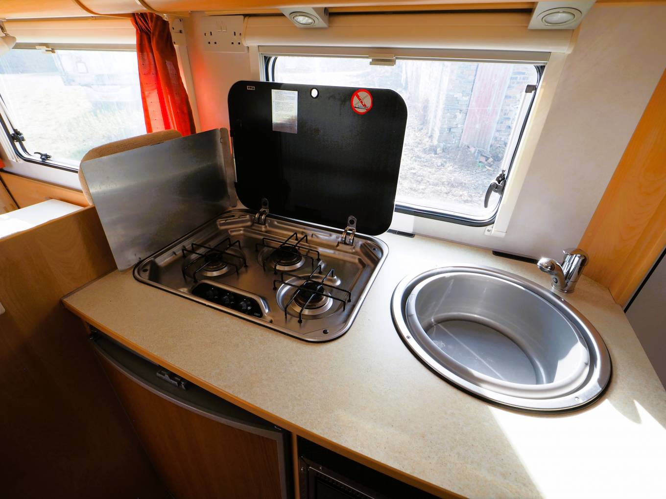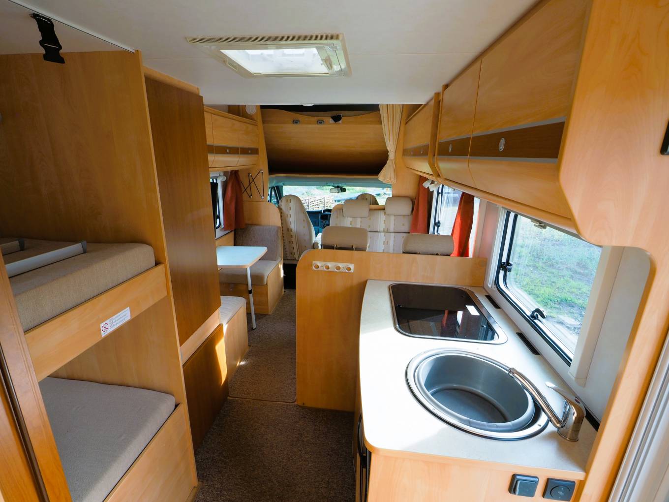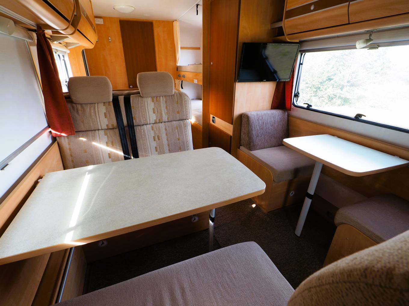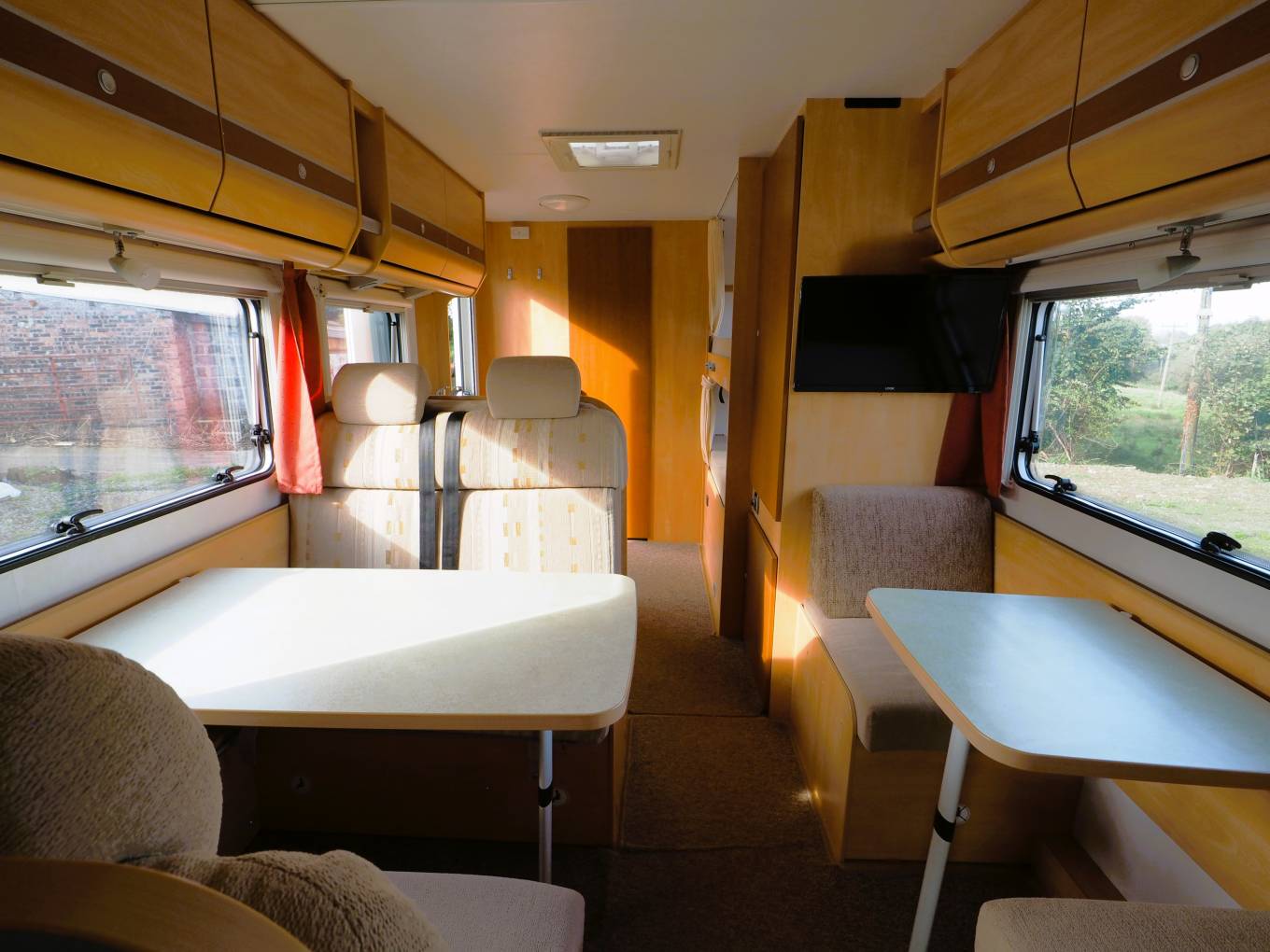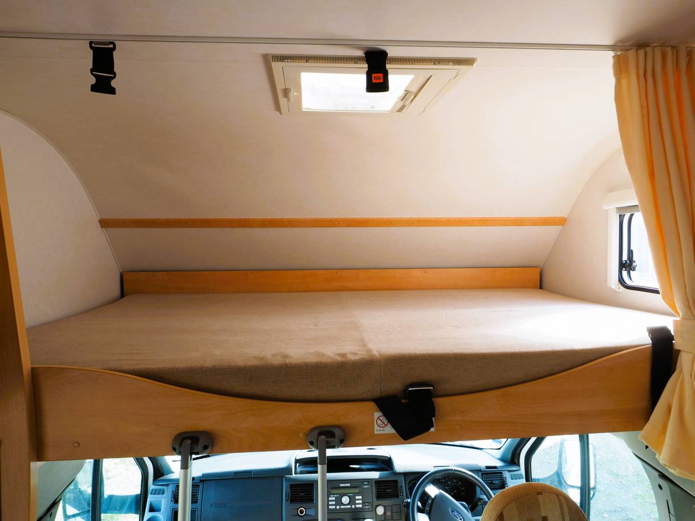 There is plenty of natural light from the large side windows and roof mounted skylights/vents. Blinds and flyscreens are fitted to all the windows with a flyscreen to the door. The front cab has a clip on window curtain and thermal screen to provide privacy and blackout for the later hours.