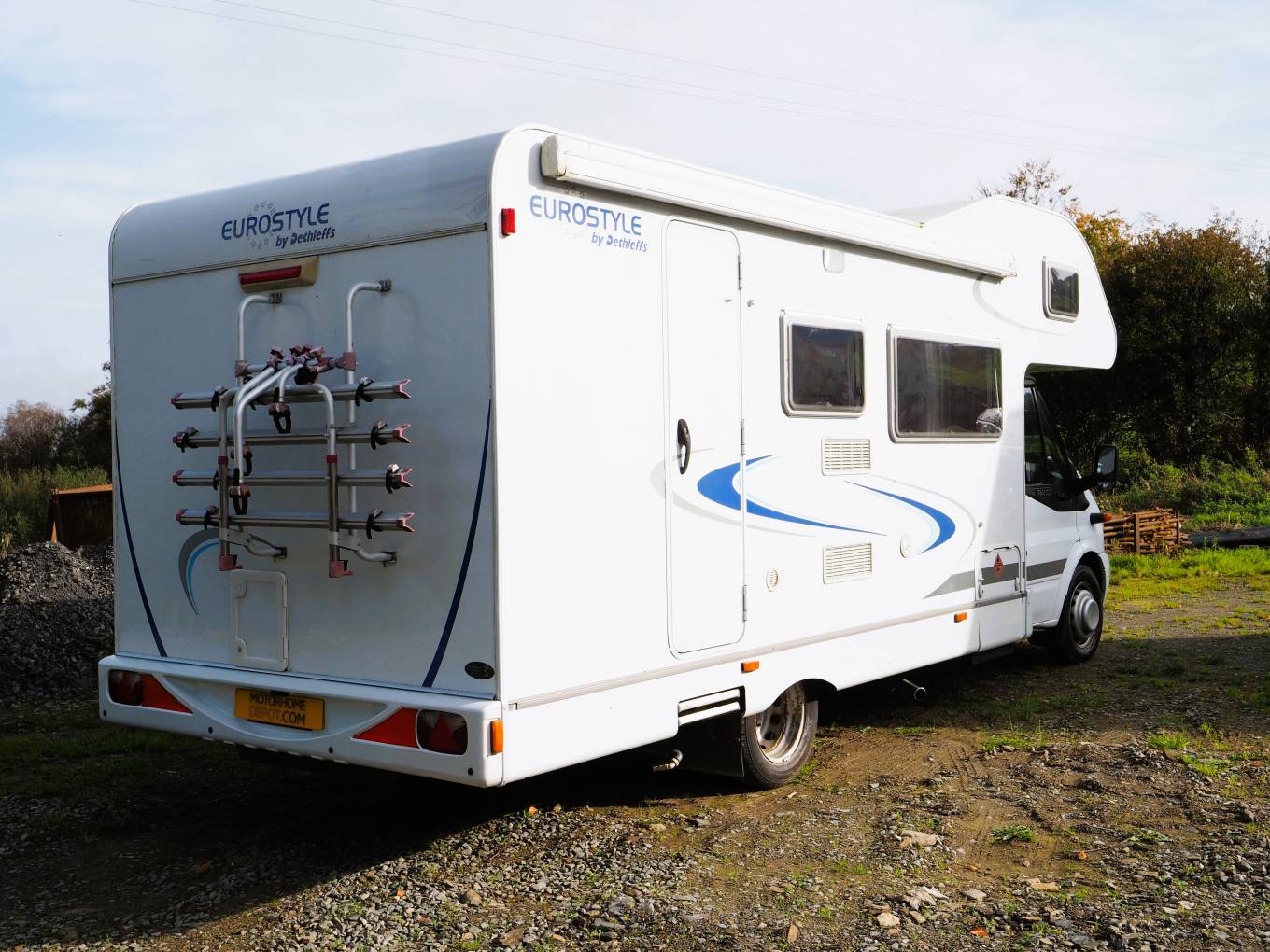 Externally there are the usual points for electric hook-up and water and access to the gas locker with two gas bottles included. To the rear there is a four bike carrier and the external access to the toilet cassette. A wind out sun canopy and electric step are fitted. A useful feature on the Eurostyle is the ability to convert the twin bunk area to garage storage space. The bed bases can be swung back to create a large storage area and there is a large external door to provide access when configured this way.