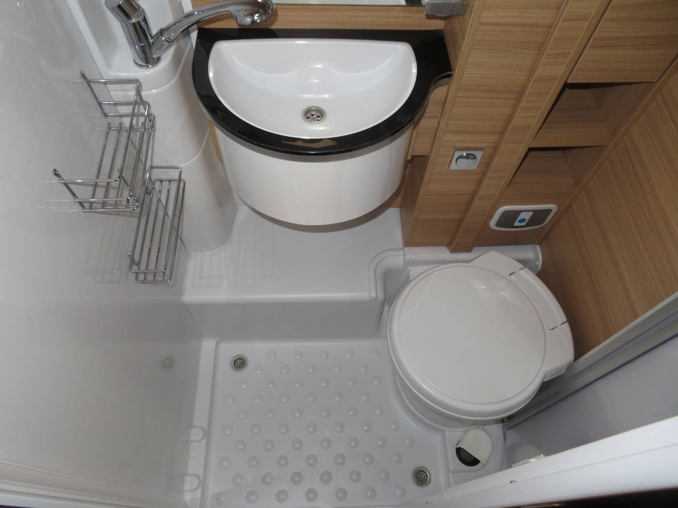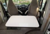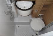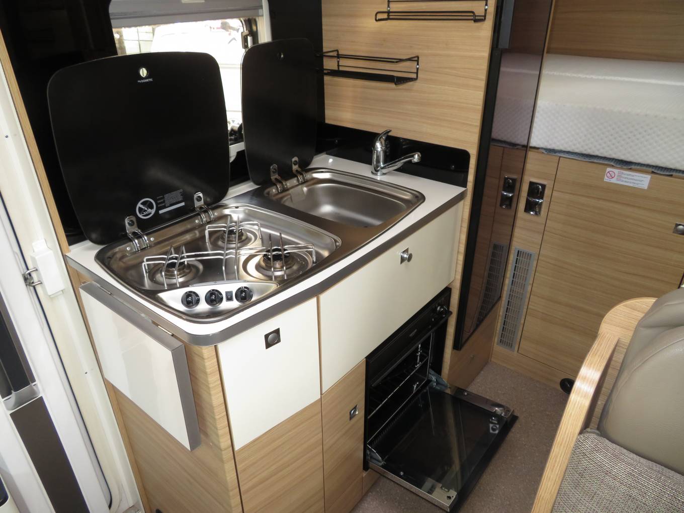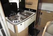 The T1 is ideal for a couple or single person with a decent sized lounge/dining area at the front of the motorhome. It is made up from a front facing double sofa and the two front seats that can be turned around and has a large moveable table in the centre. Moving back there is a well equipped kitchen area which includes a hob with 3 gas rings, oven, grill, sink with mixer tap and a long slim fridge with ice box. The motorhome is wonderful to sleep in and has a large transverse rear fixed bed (195cm x 145cm) and a further single at the front. It has an excellent washroom for the size of van and features a Thetford Flush cassette toilet, sink and shower with a clever fold out screen to create a separate cubical. The heating and hotwater is provided by the simple to use Truma I-net system.