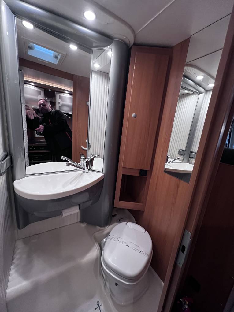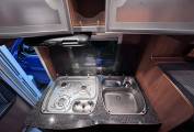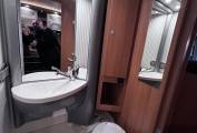 Immediately opposite the door is the well-appointed bathroom in which a shower screen folds out to prevent the cassette toilet and wall cupboards getting wet.