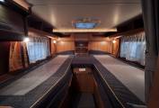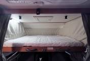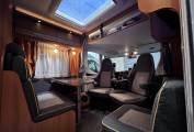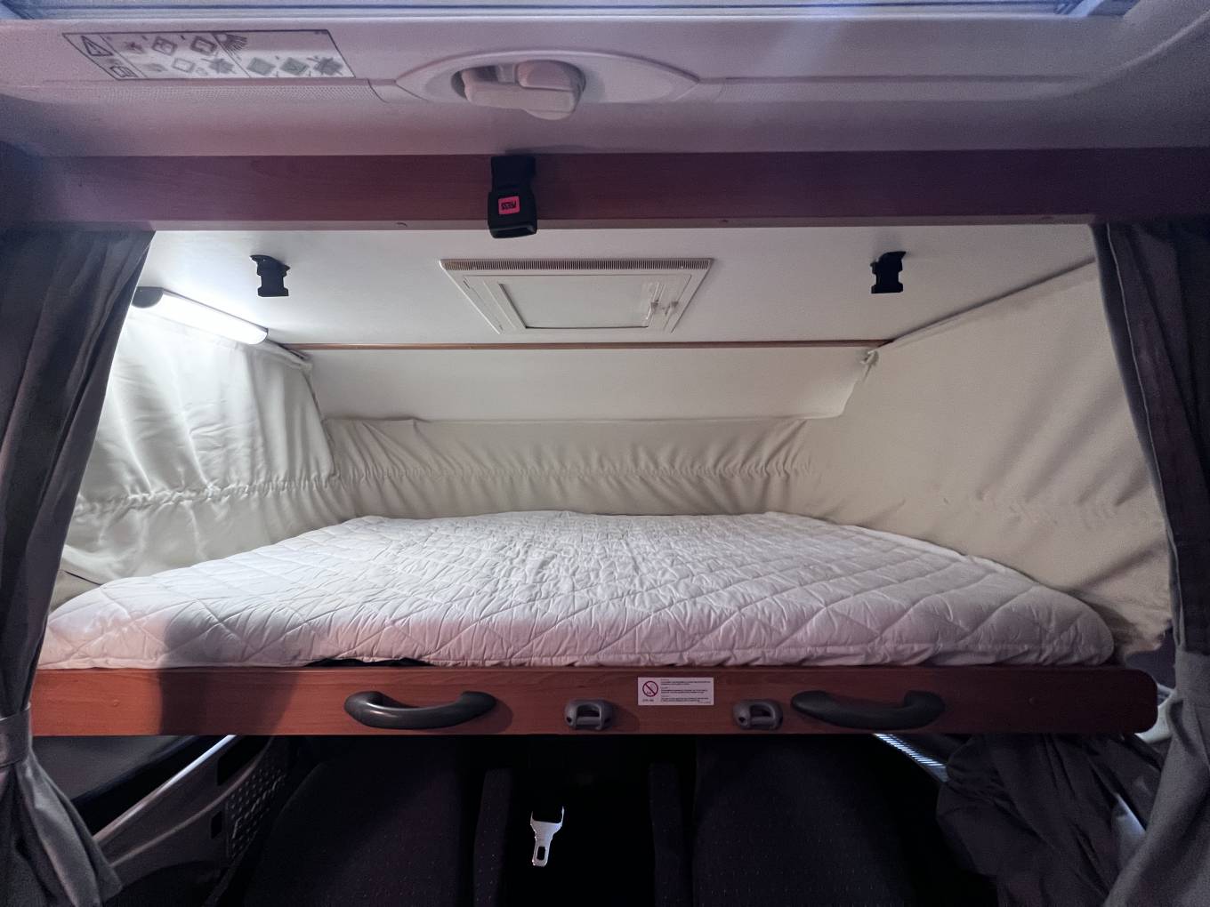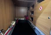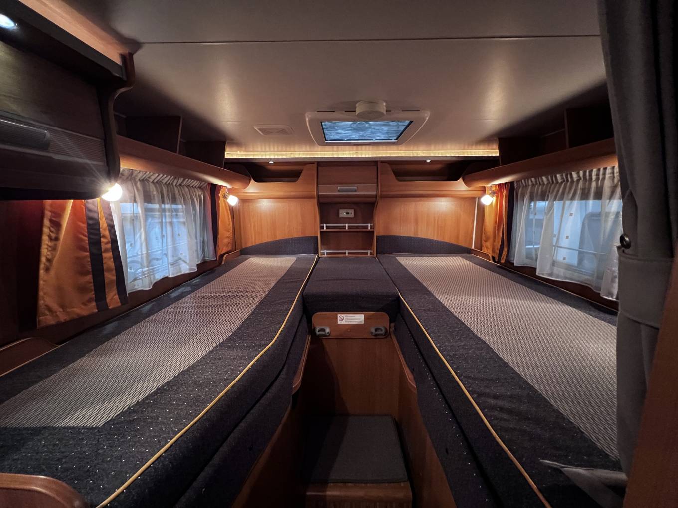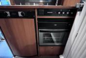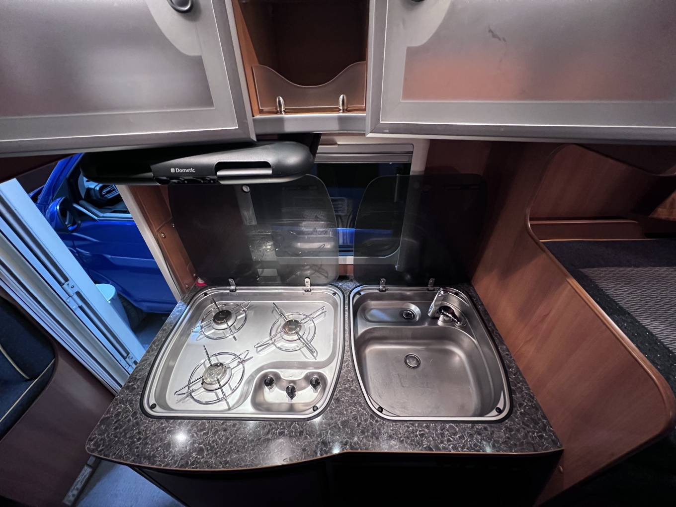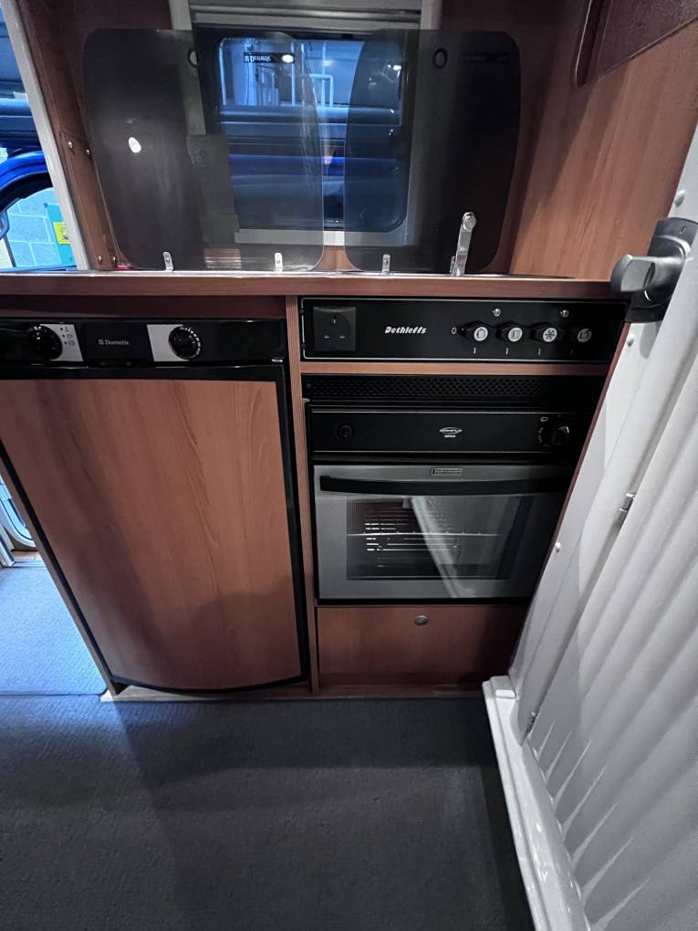The habitation door is on the offside. On entering you will find the kitchen immediately on your left. There is a full oven, hob, sink, fridge with freezer compartment and storage space. At the end of this fabulous A-Class van are two large single beds which can be easily reached on steps (with storage below) and cupboard space on either side. An infill piece can be utilised to create a huge double bed if required.