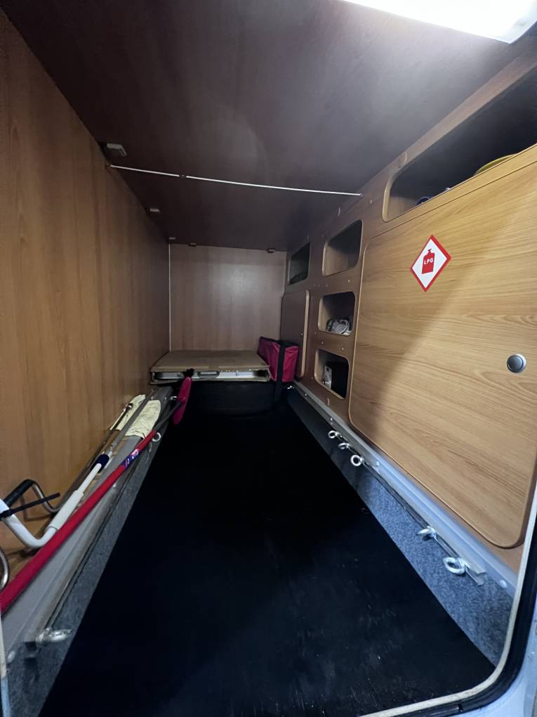 Beneath the rear beds is a large garage area with access doors at either side. The gas locker can be reached from within the garage and there is a power socket, lighting and heating vent in here too.