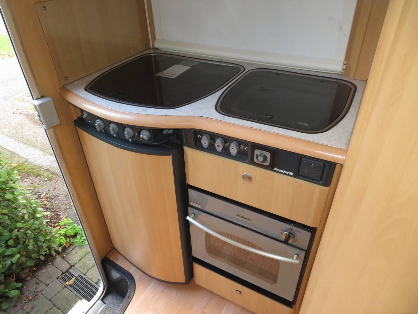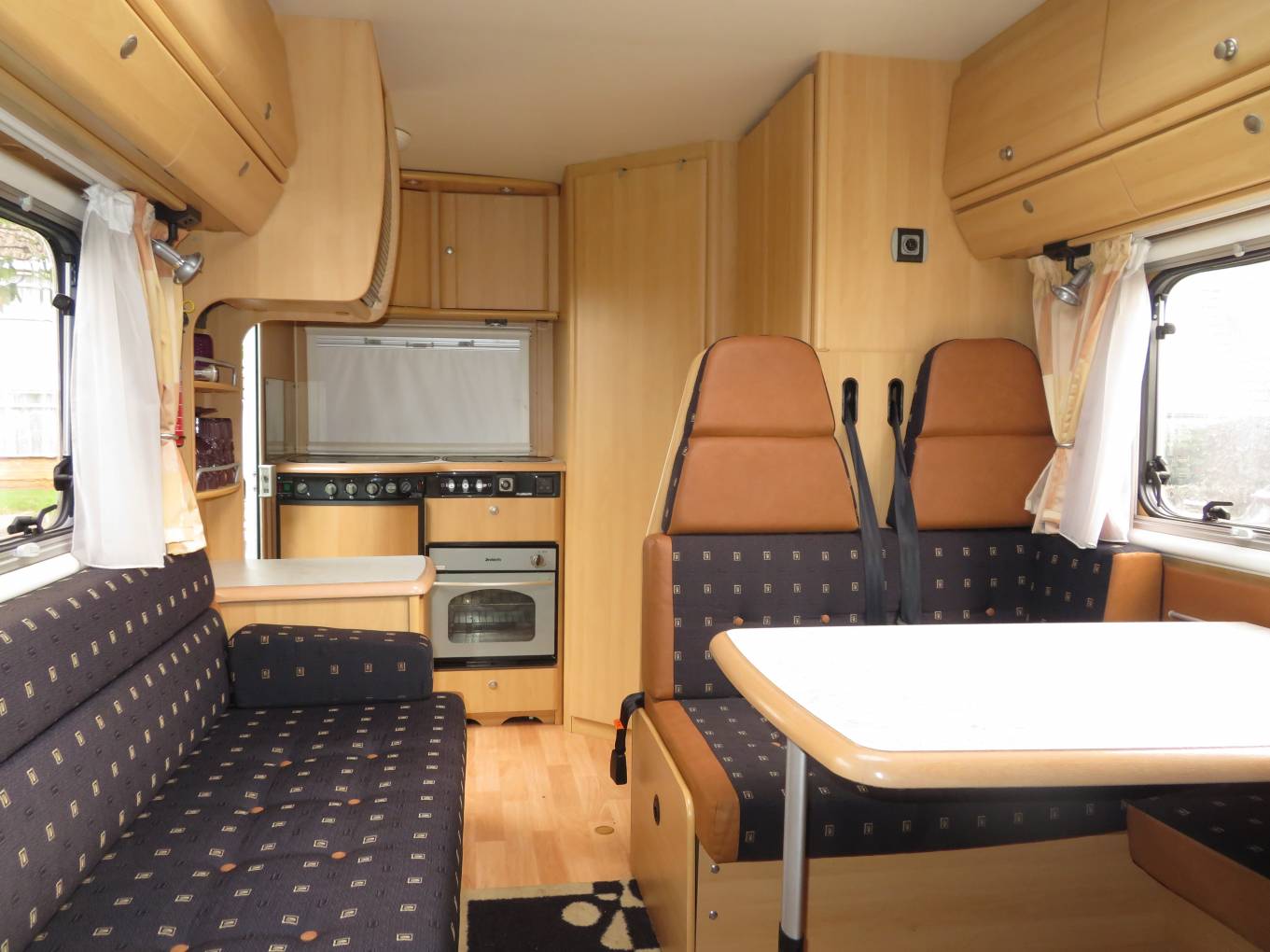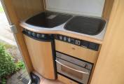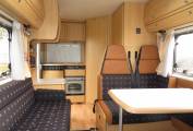 At the rear you have a well equipped kitchen area which includes oven, gas hob with three gas burners, 3-way fridge with ice compartment and sink with mixer tap.
