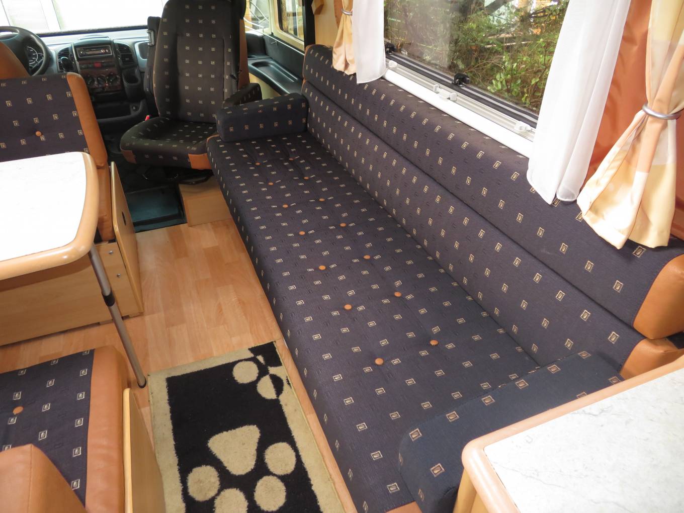 The habitation area of this motorhome is a genuinely lovely space to spend time in, spacious, bright, clean with a modern stylish design that is rarely found in motorhomes. On entering the rear of the motorhome you immediately notice the great layout. The living area has a long sofa running down the side of the motorhome and there is a dinette table opposite with two double seats. If this is not enough the passenger seat swivels to create a further seat.