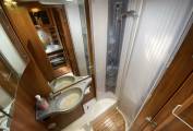 on the opposite side of the motorhome is the Bathroom where there is a Thetford swivel bowl cassette toilet, a wash handbasin and a circular semi separate shower. Also plenty of cupboards in here.