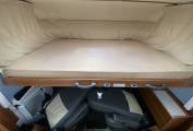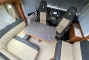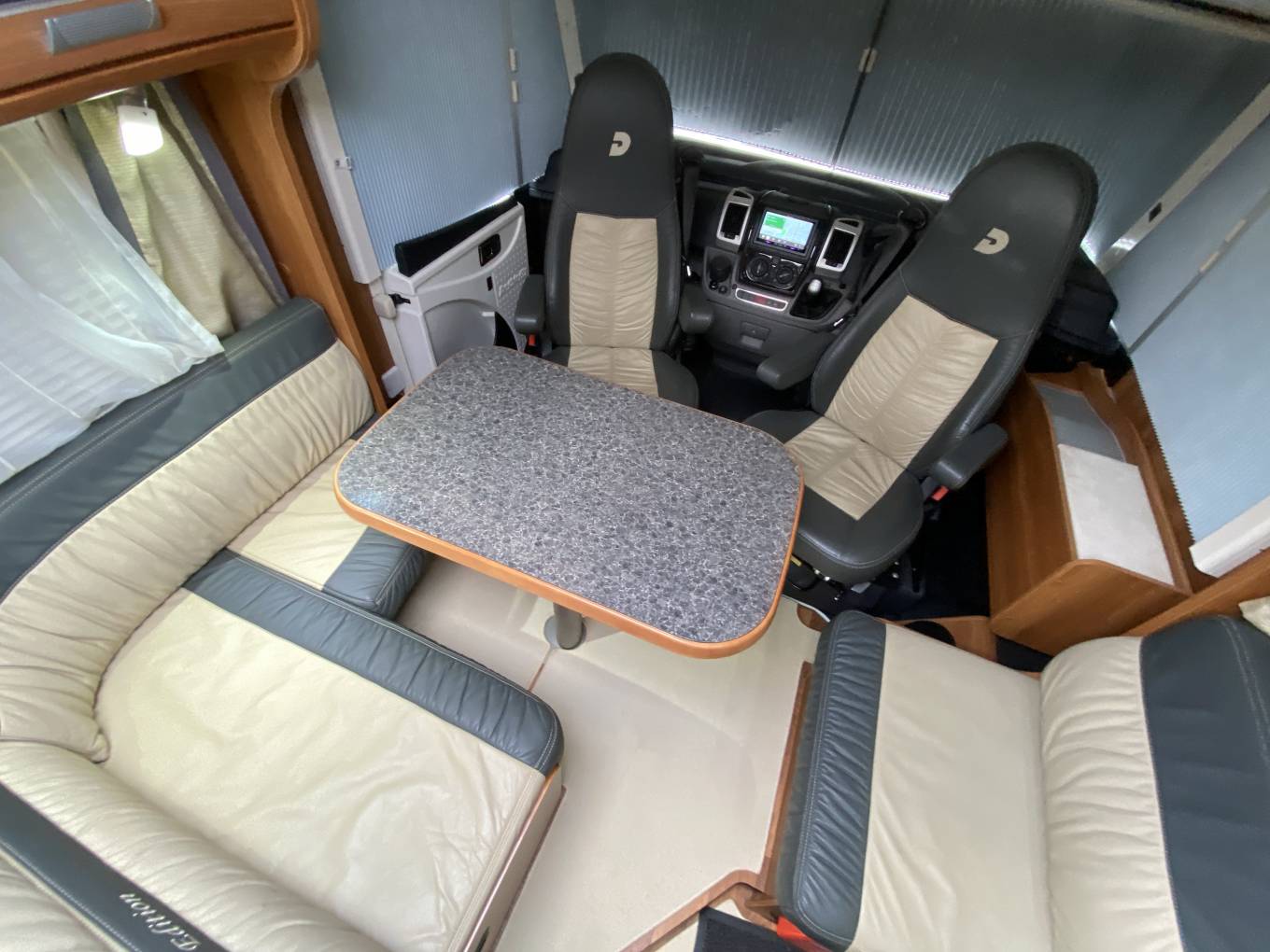 On entering via the habitation door, in front of you is the front lounge and dining area consisting of two inward facing settees, twin belted forward facing seats and two captains chairs that swivel round to face the table when you are not driving.