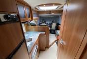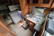 The kitchen is at the centre of the motorhome behind the the rear travelling seats, where you will find a three burner gas hob with extractor fan above, an oven with an internal grill, a three energy source Dometic fridge freezer, the sink with hot and cold water supply and plenty of cupboard space.