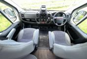 The spacious dinette can seat two people and the front chairs swivel to give you enough seating space for four people. The Sunlight Cliff boasts excellent storage at the rear with enough space for all of your gear and valuables. The bathroom is a good size with a toilet and shower. The Combi boiler and heater can be operated on gas.