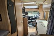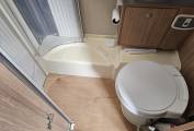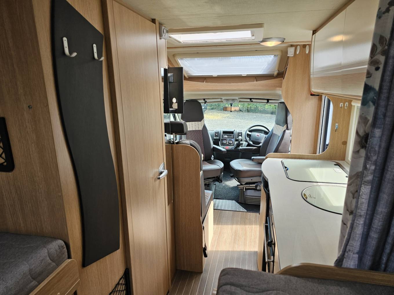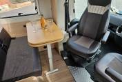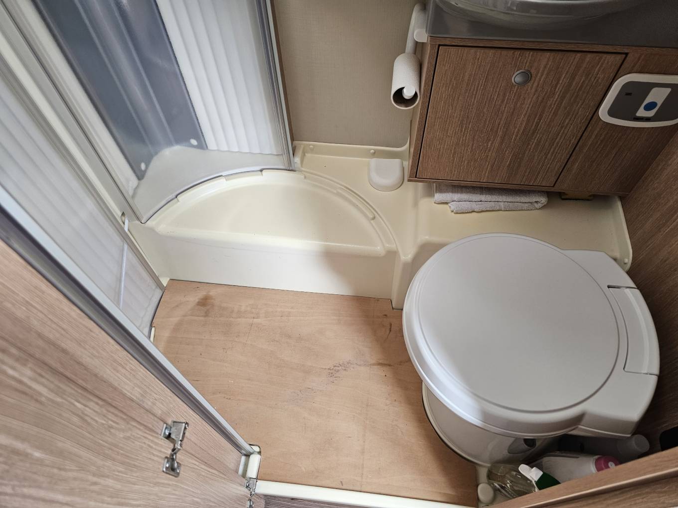 Stepping into the van via the electric steps you have twin swivel captains seats with armrests in brown leather. There is an extendable motorhome table (third party) which allows a dynamic dining and entertaining space. there are 2 forward facing belted passenger seats in brown leather. Above this is the sizeable 12v/240v television which has an articulated arm to allow viewing from bedroom as well as lounge area. Behind this is the fully functional shower room with sink and cassette toilet as well as shower with boarded floor.