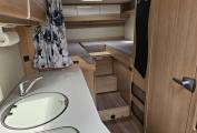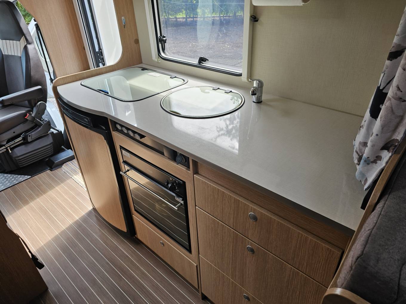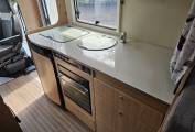 Coming back down the off side we have the good sized kitchen galley area with plenty of worktop space, power point, 3 ring gas hob, sink and Thetford oven and grill below.