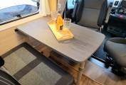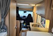 On entering the van via the electric step, you are in the lounge area. The forward facing seats have 2 passenger belts and sit beneath the TV DVD unit. Both front seats swivel to provide a comfortable dining area for up to 4 people.