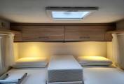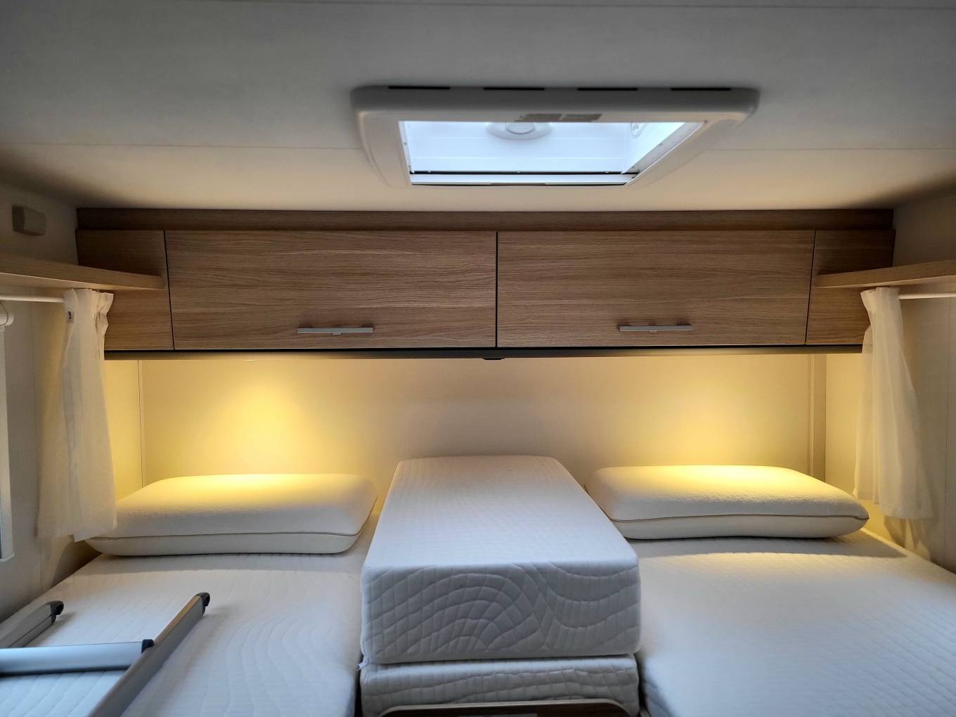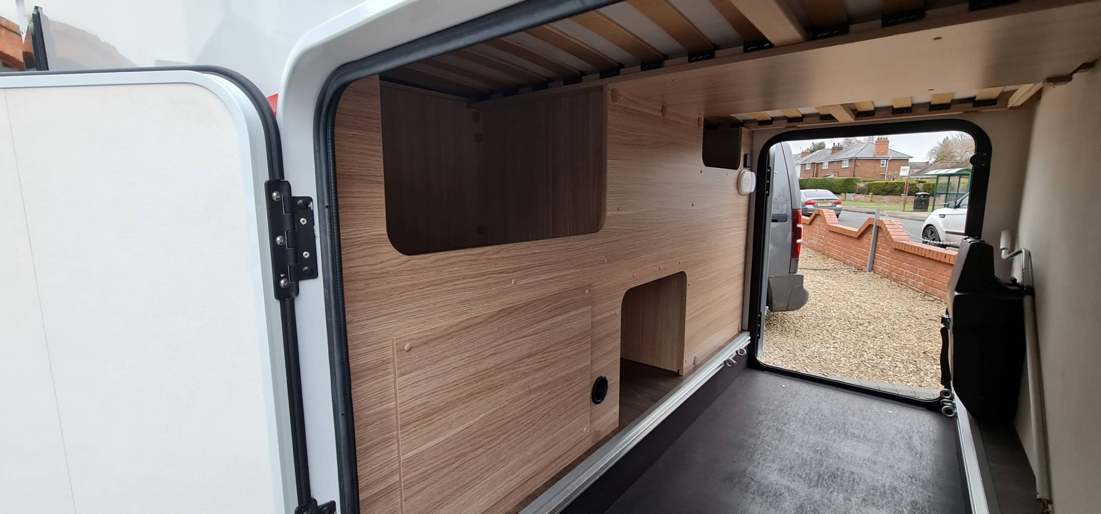 Sitting on top of this is the comfortable single bed arrangement, that can easily be converted via the use of a slide board and additional infill cushion to a massive double bed spanning the entire width of the van. The bed has integrated LED lights under the wall mounted cabinets.