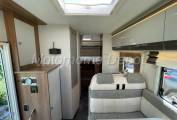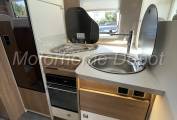 Moving rear is the L shaped kitchen which consist of: brushed metal round sink with chrome mixer tap; 3 gas burner hob with glass cover. Below the counter is a good sized oven & grill there is plenty of cupboard and drawer space for all your holiday provisions. To the left is a tall Thetford absorber fridge with freezer box, this can be powered automatically by: 240v, 12v or gas depending if you are plugged in on site or wild camping.