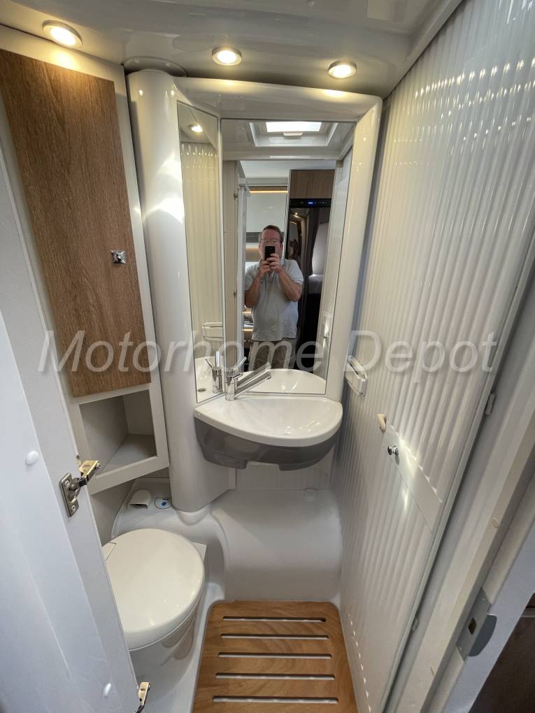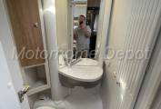 Opposite the kitchen is the all in one bathroom with a Thetford fresh water flush swivel head cassette style toilet. The shower area has a clever rotating wall that opens to keep the toilet area dry whilst in use.