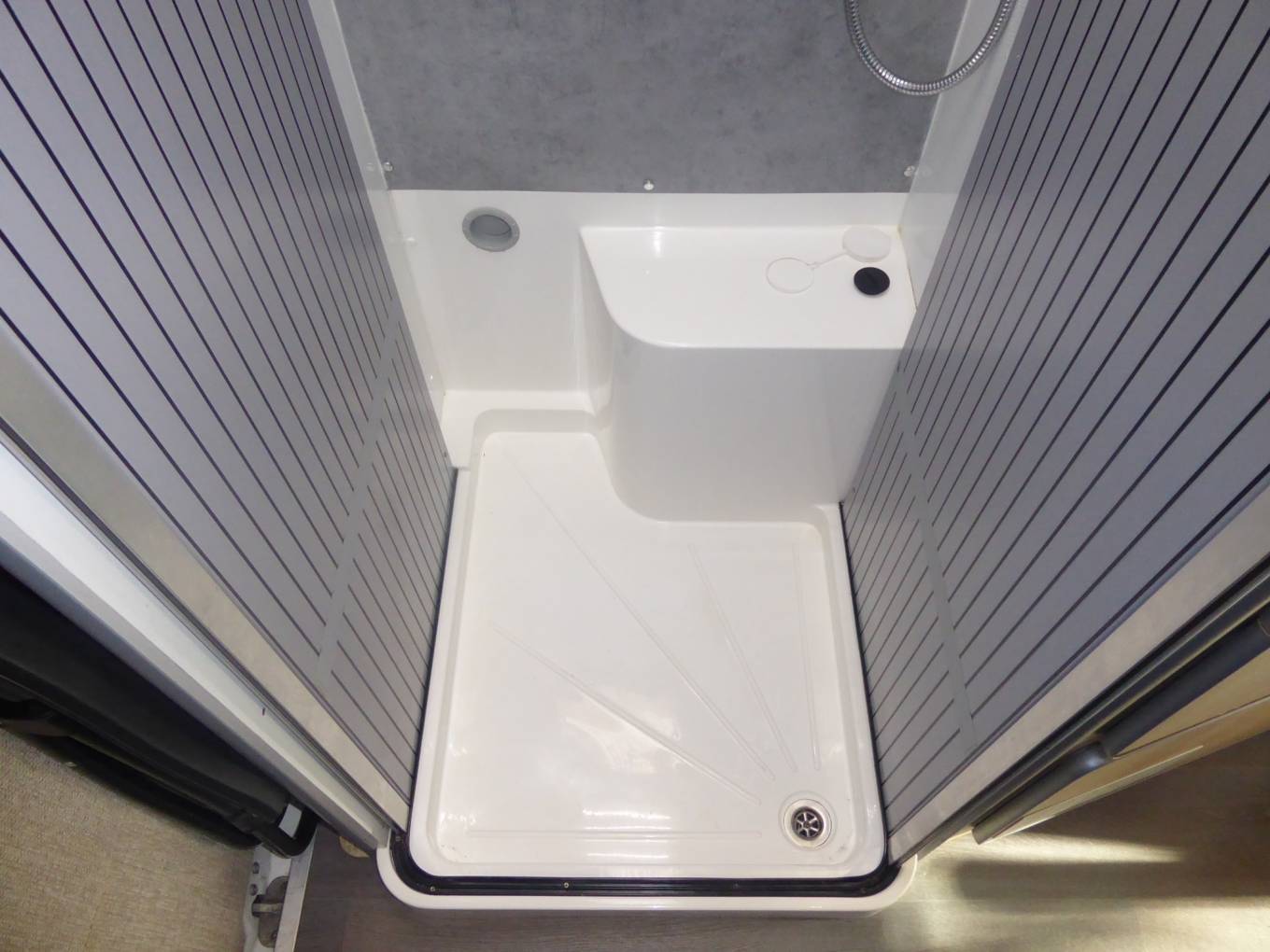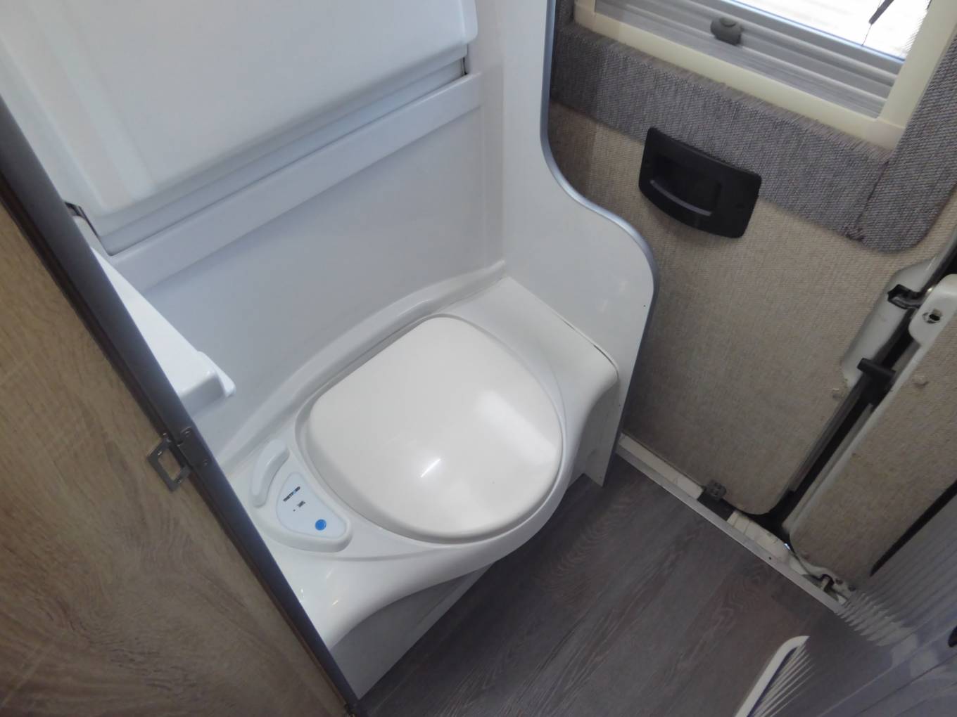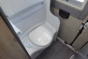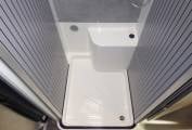 At the back of the camper is the bathroom featuring a toilet, a hand basin, and a separate shower cubicle.