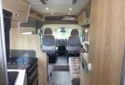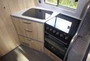 Behind the nearside habitation seat is a hob with 3 gas burners and an electric plate, an oven, a grill, and a sink. Opposite this is a fridge with a freezer box beneath worktop space, and a wardrobe.