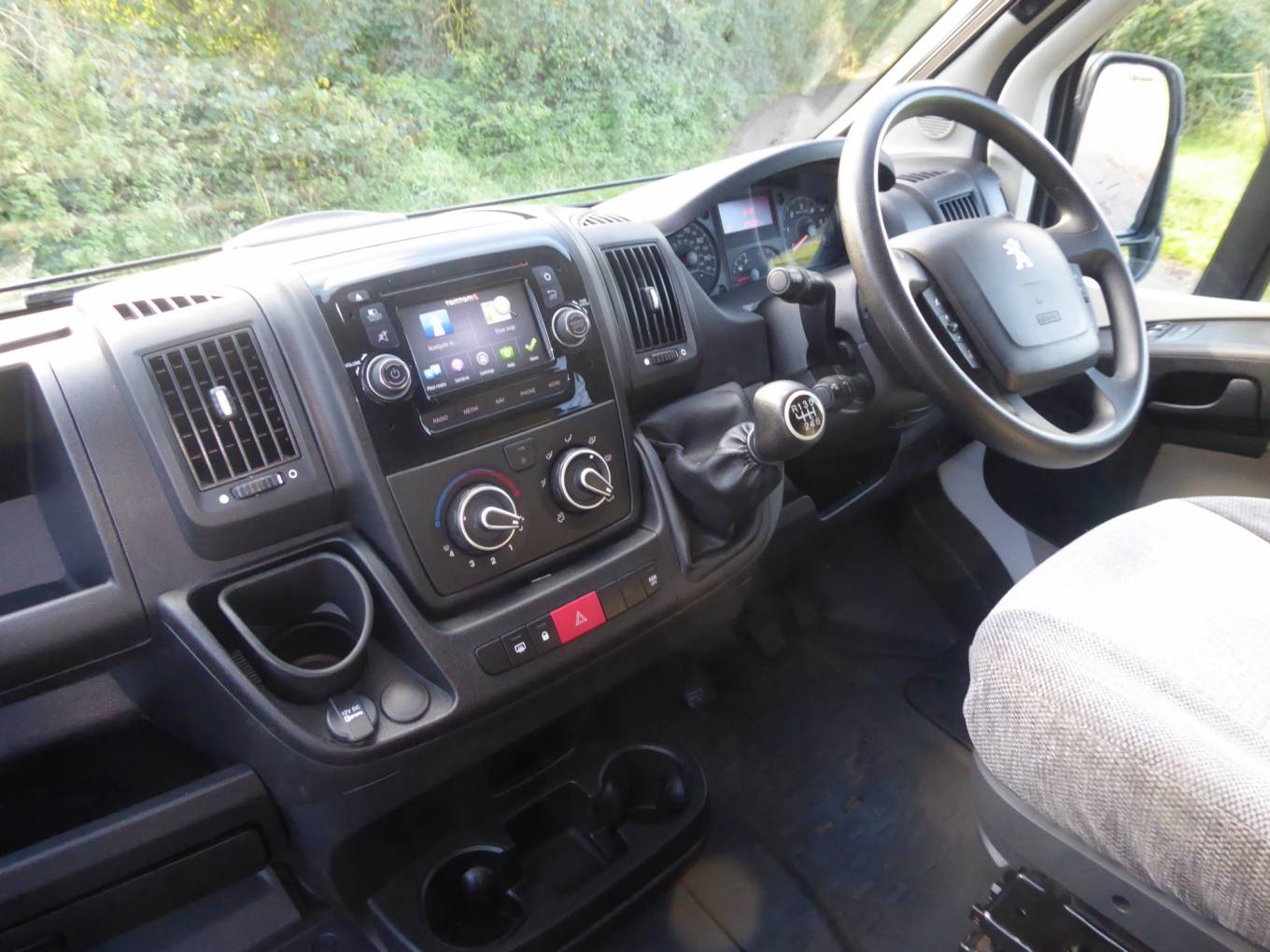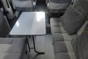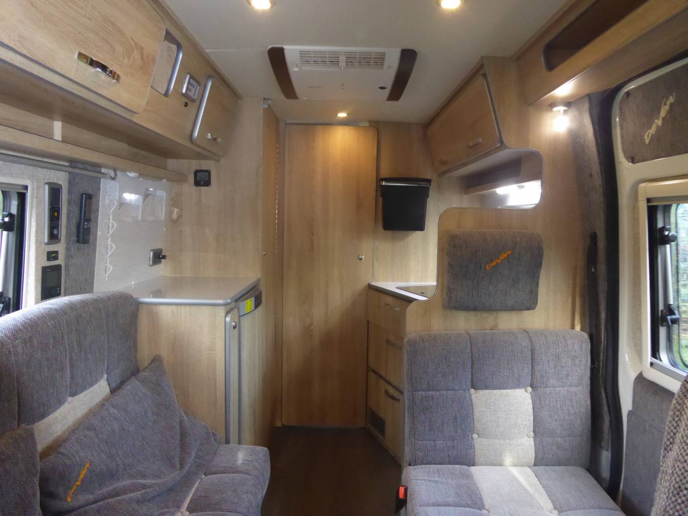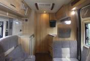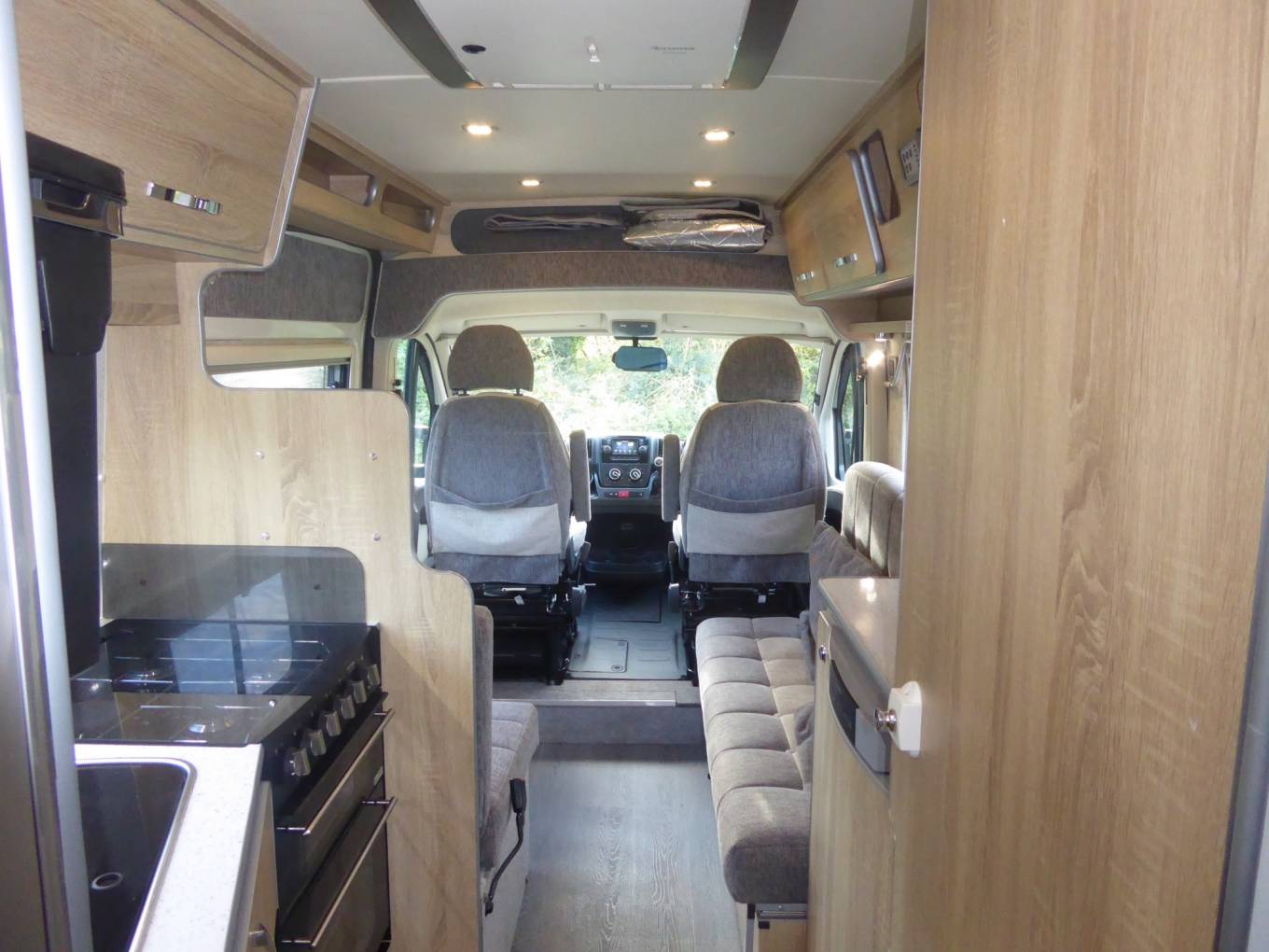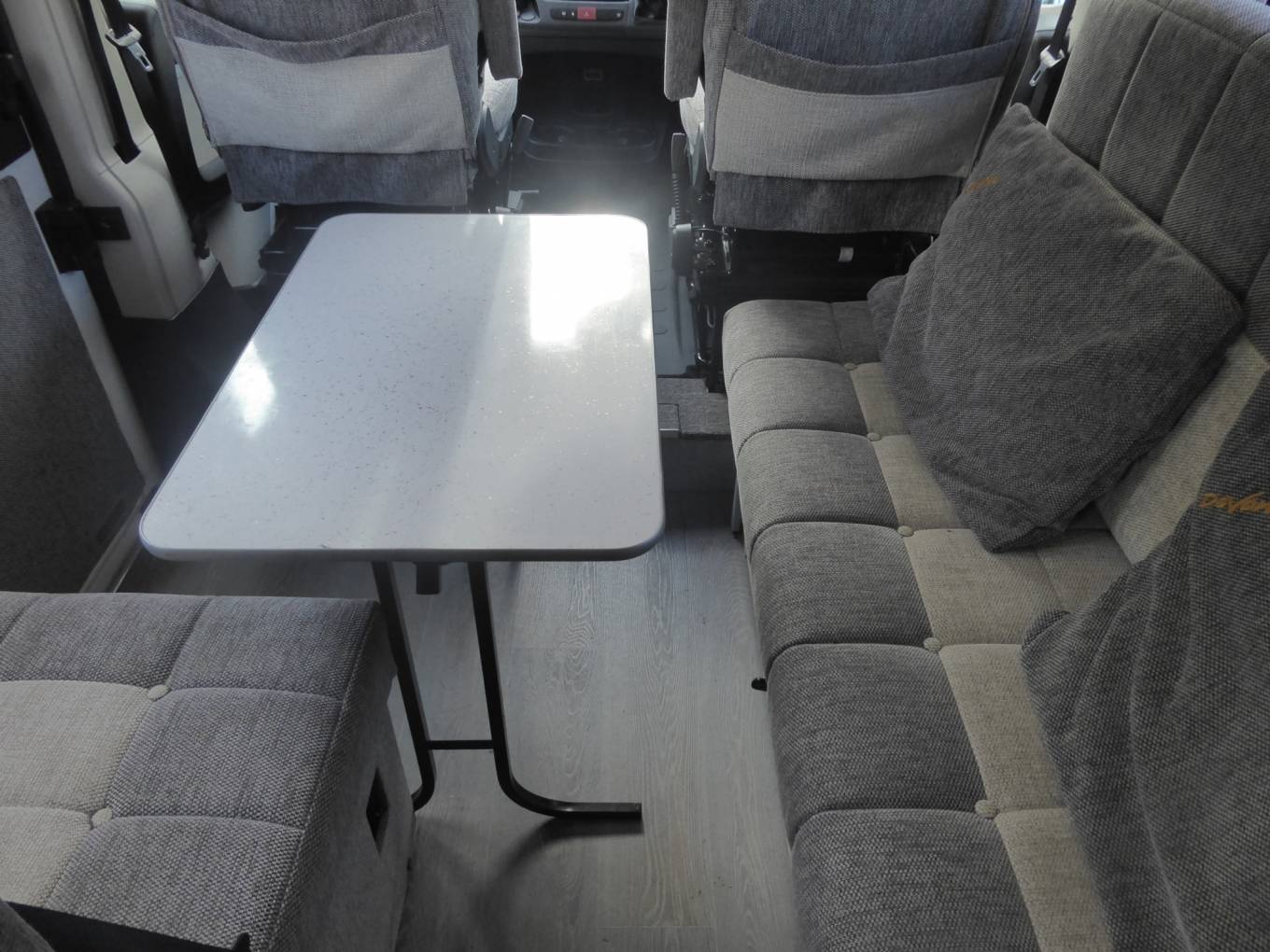This vehicle has a single nearside forward facing passenger seat behind the cab (with an additional seat belt), and an offside side sofa opposite the side door. This dining/leisure area can be enhanced by the use of the swivel cab seats and a free standing table. The habitation seating can be readily converted into a transverse double berth.