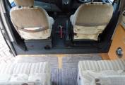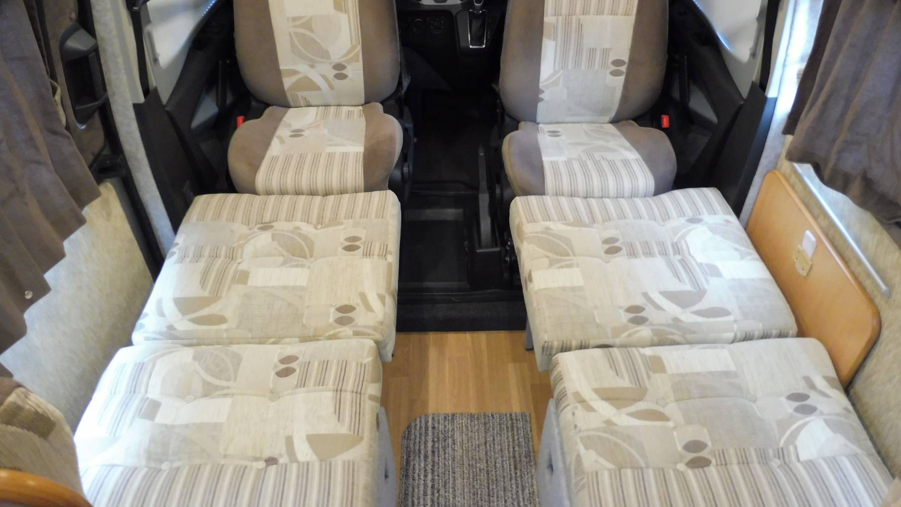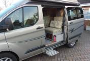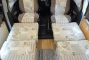 As you enter the camper from the side sliding door there is a comfortable lounge area which consists of swivel front captain’s chairs and 2 rear forward facing belted seats along with tables which are stored away whilst traveling, one of which has a tripod stand so can be used to picnic outside if desired. This area quickly converts into 2 single beds during the evening.