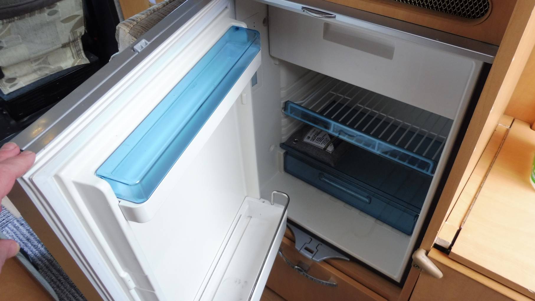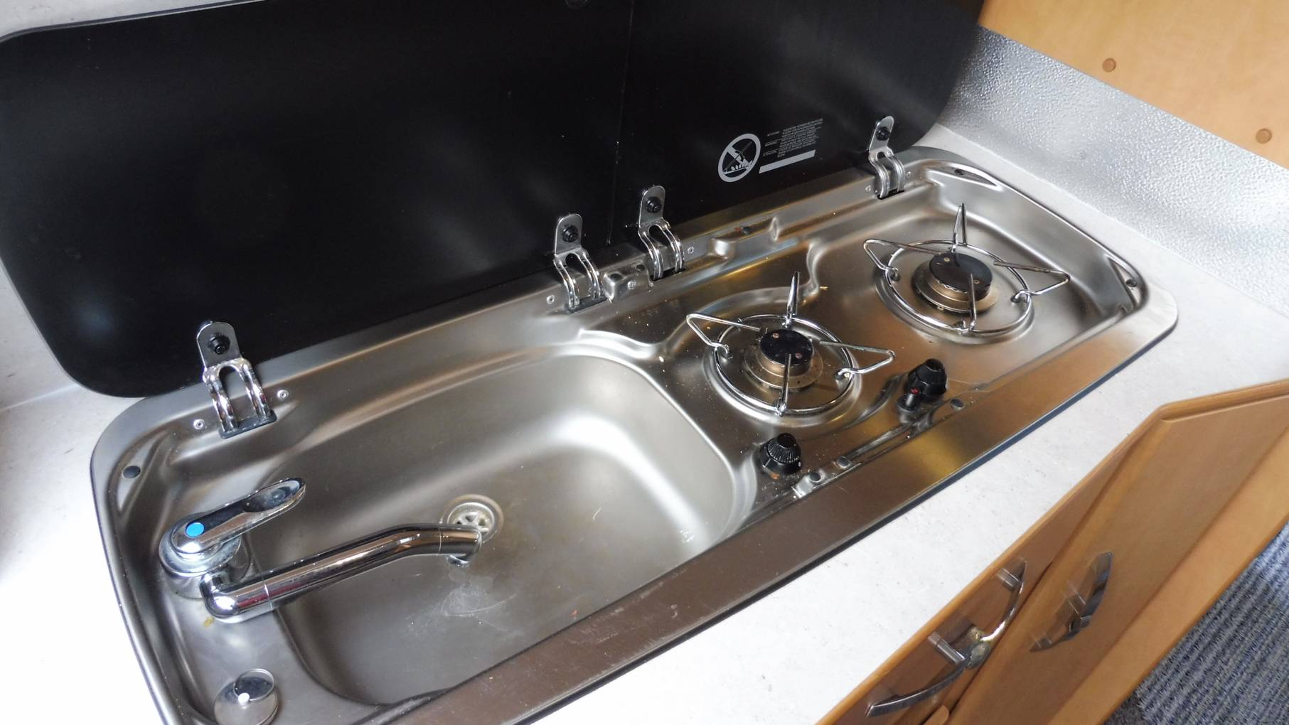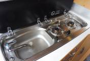 The rear end kitchen is practical with a sink, 2 hob burner, microwave and 12v fridge. There is plenty of storage in the cleverly designed camper.