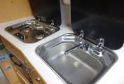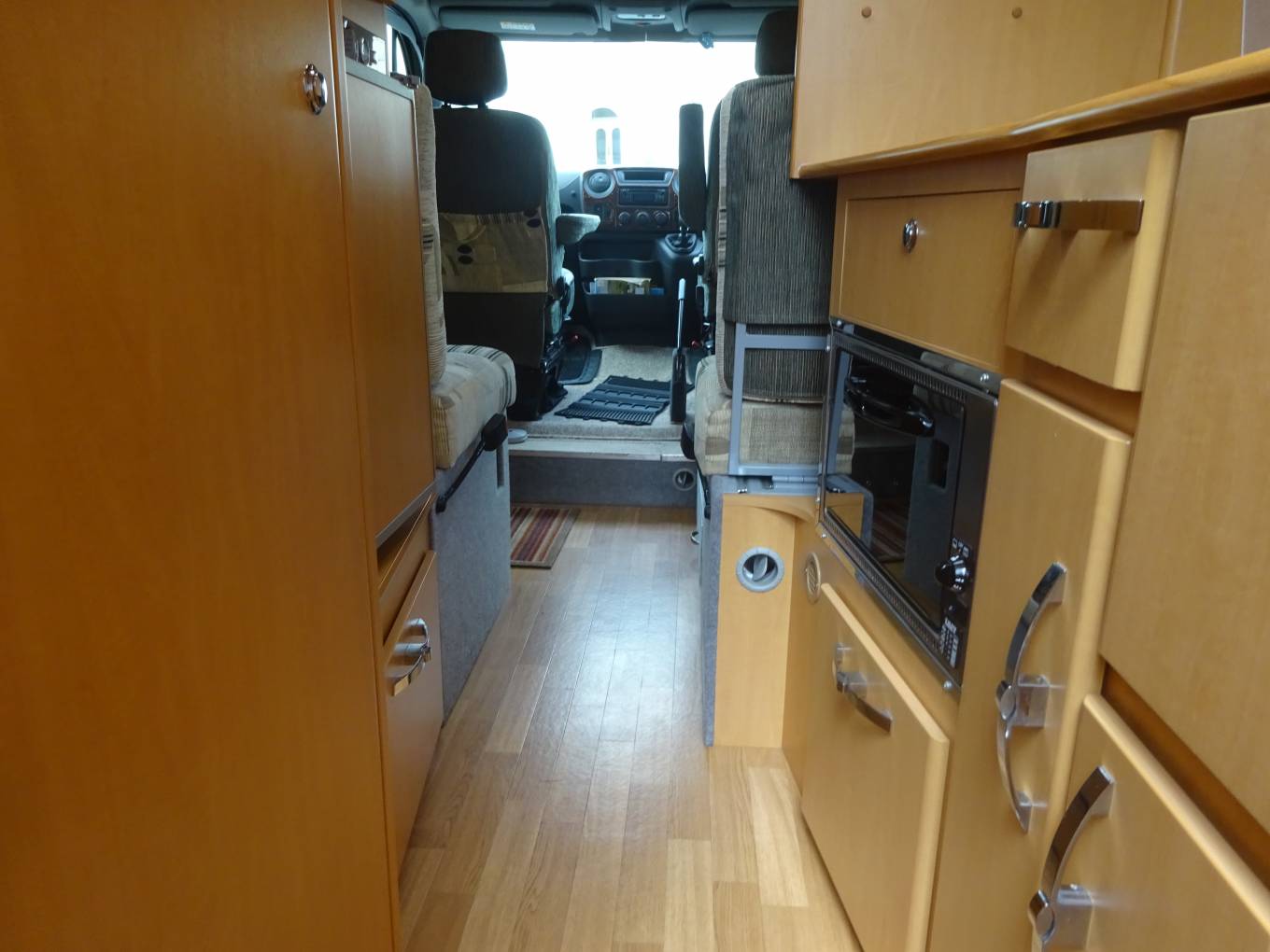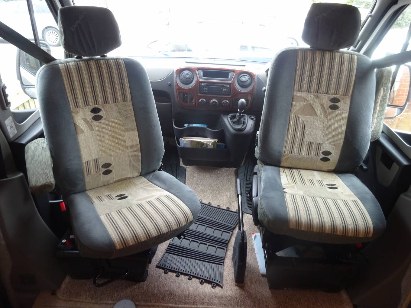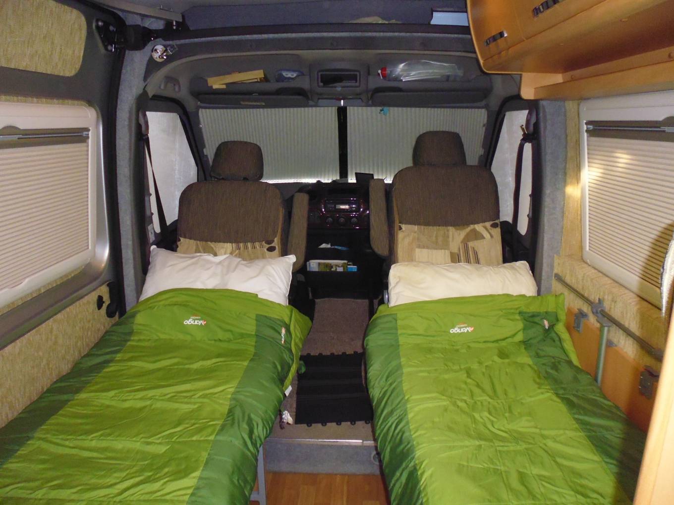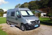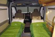 Cab air conditioning, 6 speed 2.3 litre diesel. Short wheelbase, very usable, fits into standard parking spots. Four travelling belts. The two rear seats easily convert to two single beds, with additional length for taller persons by swivelling the front seats.