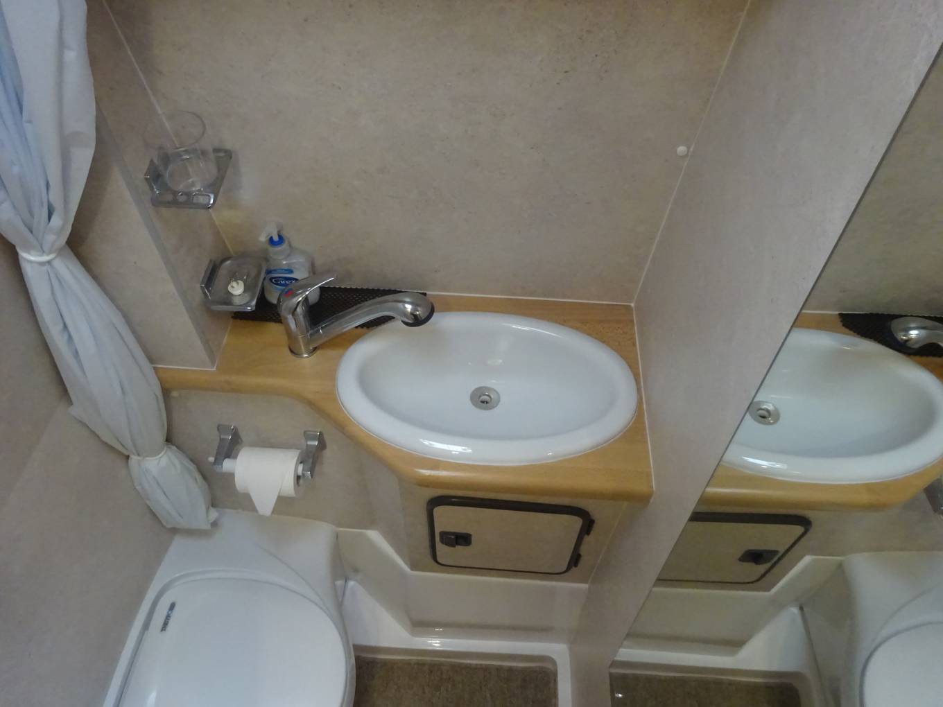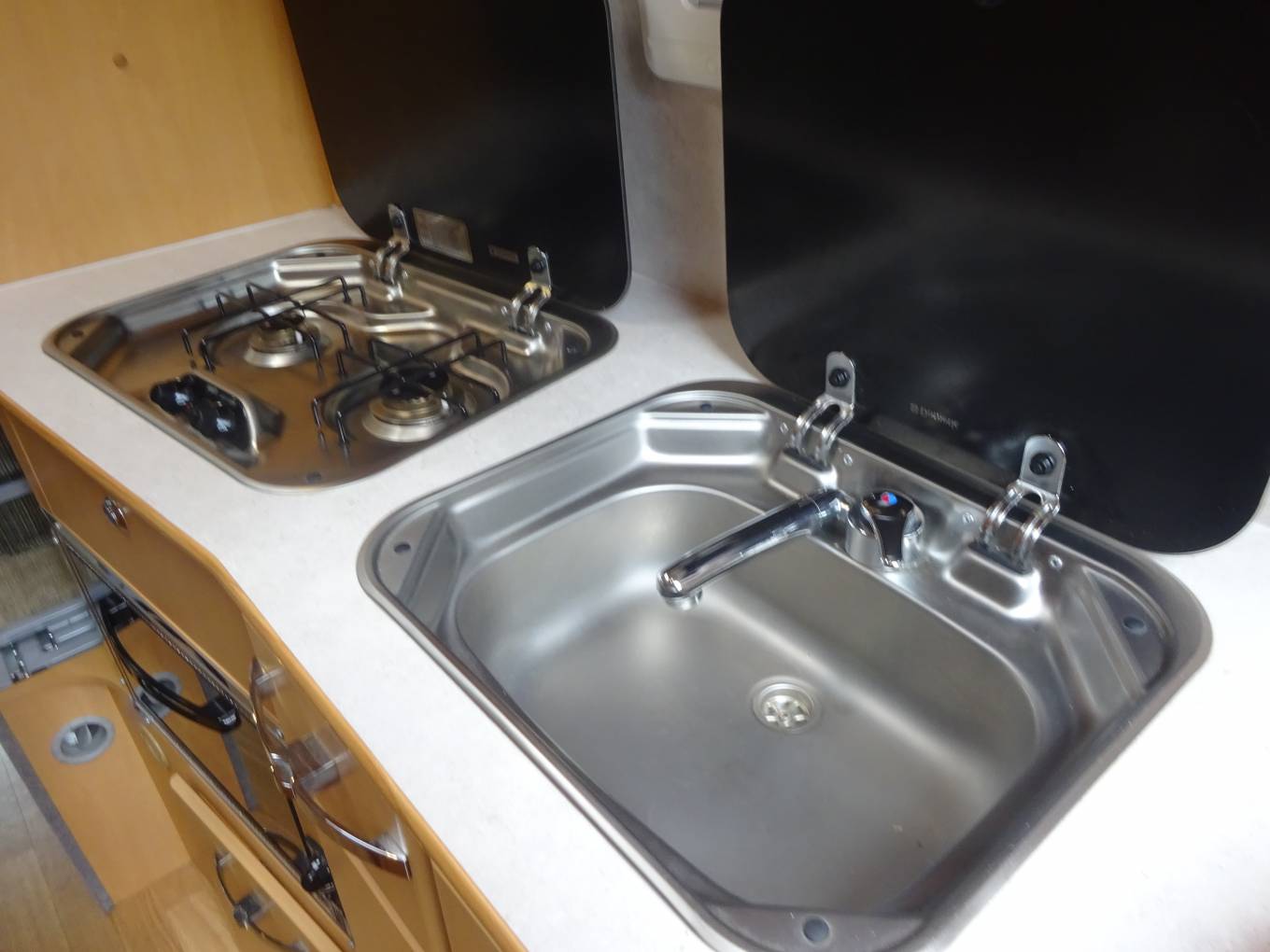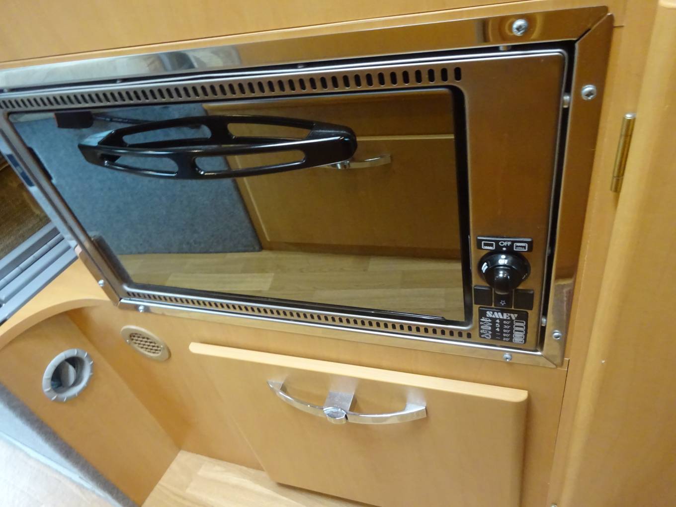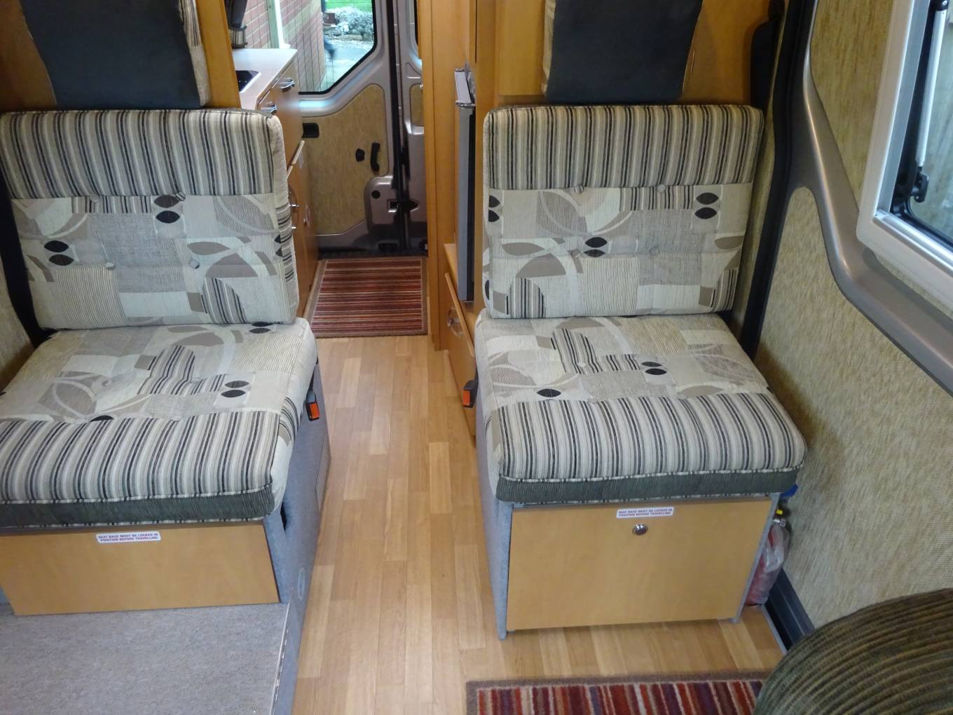 The Truma heating system operates on gas and mains electricity through blown air vents. There are two nifty storage units in the dinette footwell, for various items such as hook up leads.